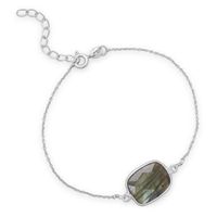 7" + 1" extension sterling silver bracelet with faceted labradorite stone. The size and shape of the stone will vary. The approximate size of the stone will be 10.5mm x 13mm. This bracelet has a spring ring closure. .925 Sterling Silver
