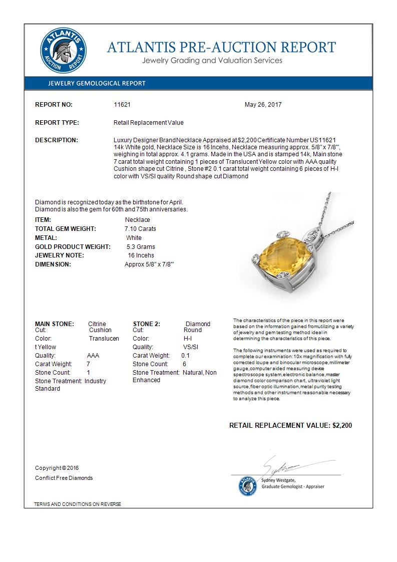 7.10 CTW Citrine & Diamond Necklace 14K White Gold ---- Luxury Designer Brand Necklace Appraised Retail Price at $2,200 ---- SKU Number US11621 14k White gold Necklace Size is 16 Incehs, Necklace measuring approx. 5/8" x 7/8'", weighing in total approx. 4.1 grams. Made in the USA and is stamped 14k, Main stone 7 carat total weight containing 1 pieces of Translucent Yellow color with AAA quality Cushion shape cut Citrine , Stone #2 0.1 carat total weight containing 6 pieces of H-I color with VS/SI quality Round shape cut