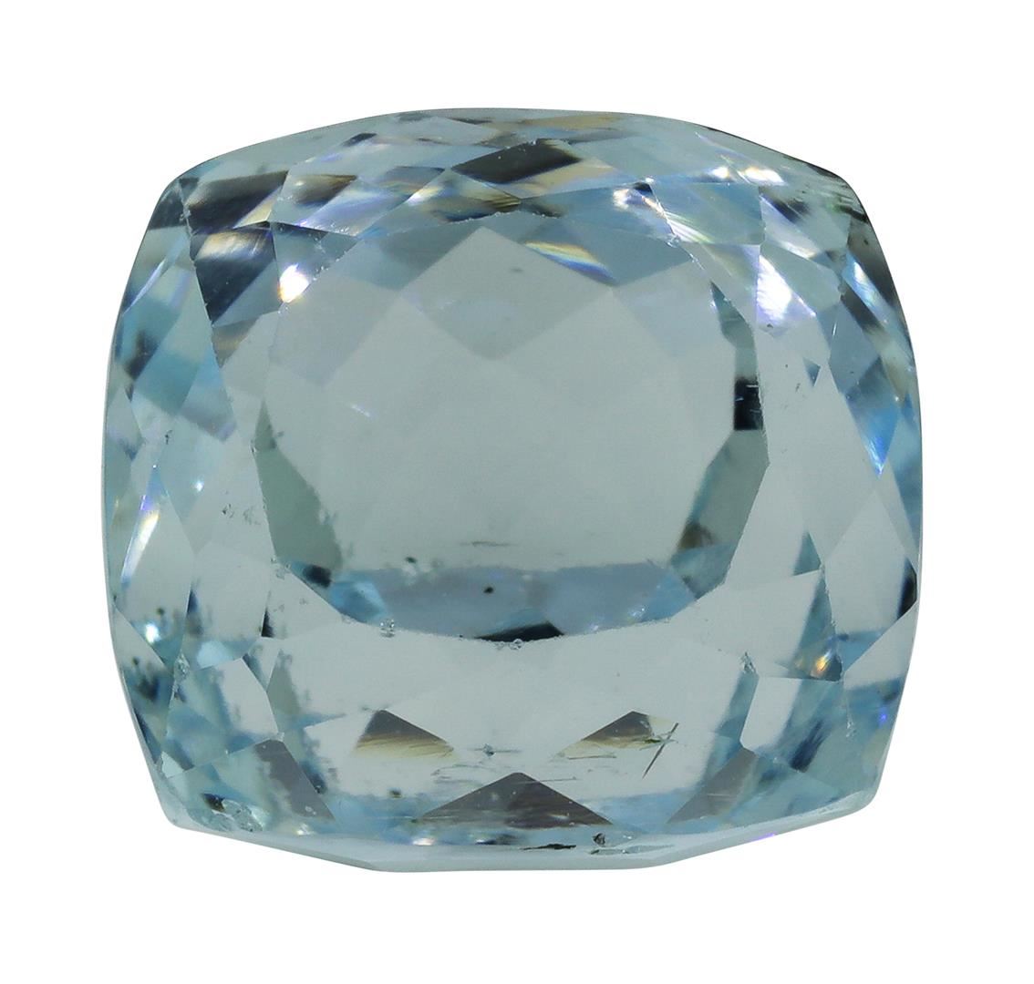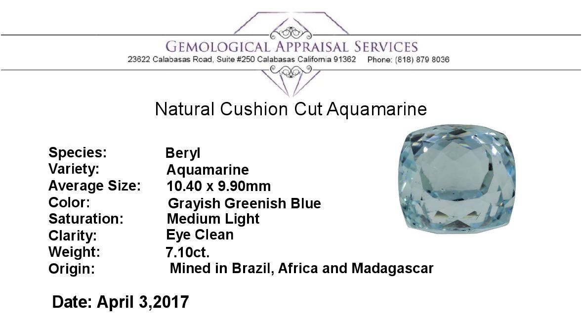 One natural cushion cut aquamarine with an exact weight of 7.10ct., clarity is eye clean, grayish greenish blue, medium light. Gemological Appraisals Services estimates the retail value at $2236.5 GAS Appraised.
