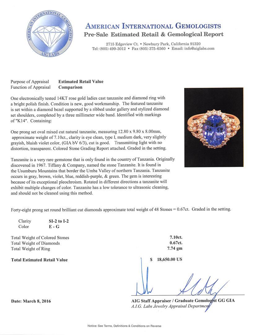 One electronically tested 14KT rose gold ladies cast tanzanite and diamond ring with a bright polish finish. The featured tanzanite is set within a diamond bezel supported by a ribbed under gallery and stylized diamond set shoulders, completed by a three millimeter wide band. Identified with markings of "K14". Condition is new, good workmanship. Containing: One prong set oval mixed cut natural tanzanite, measuring 12.80 x 9.80 x 8.00mm, approximate weight of 7.10ct., clarity is eye clean, type I, medium dark, very slightly grayish, bluish violet color, (GIA bV 6/3), cut is good. Transmitting light with no distortion, transparent. Colored Stone Grading Report attached. Graded in the setting. Tanzanite is a very rare gemstone that is only found in the country of Tanzania. Originally discovered in 1967. Tiffany & Company, named the stone Tanzanite. It is found in the Usumburu Mountains that border the Umba Valley of northern Tanzania. Tanzanite occurs in gray, brown, violet, blue, reddish-purple, & green. The gem is interesting because of its exceptional pleochroism. Rotated in different directions a tanzanite will exhibit multiple changes of color. Tanzanite has a low tolerance to ultrasonic cleaning, and should not be cleaned using this method. Forty-Eight prong set round brilliant cut diamonds approximate total weight of 48 Stones = 0.67ct. Graded in the setting. Clarity: SI-2 to I-2. Color: E - G. Total Weight of Colored Stones 7.10ct. Total Weight of Diamonds 0.67ct. Total Weight of Ring 7.74gm. AIG Appraised at $18,650.00.