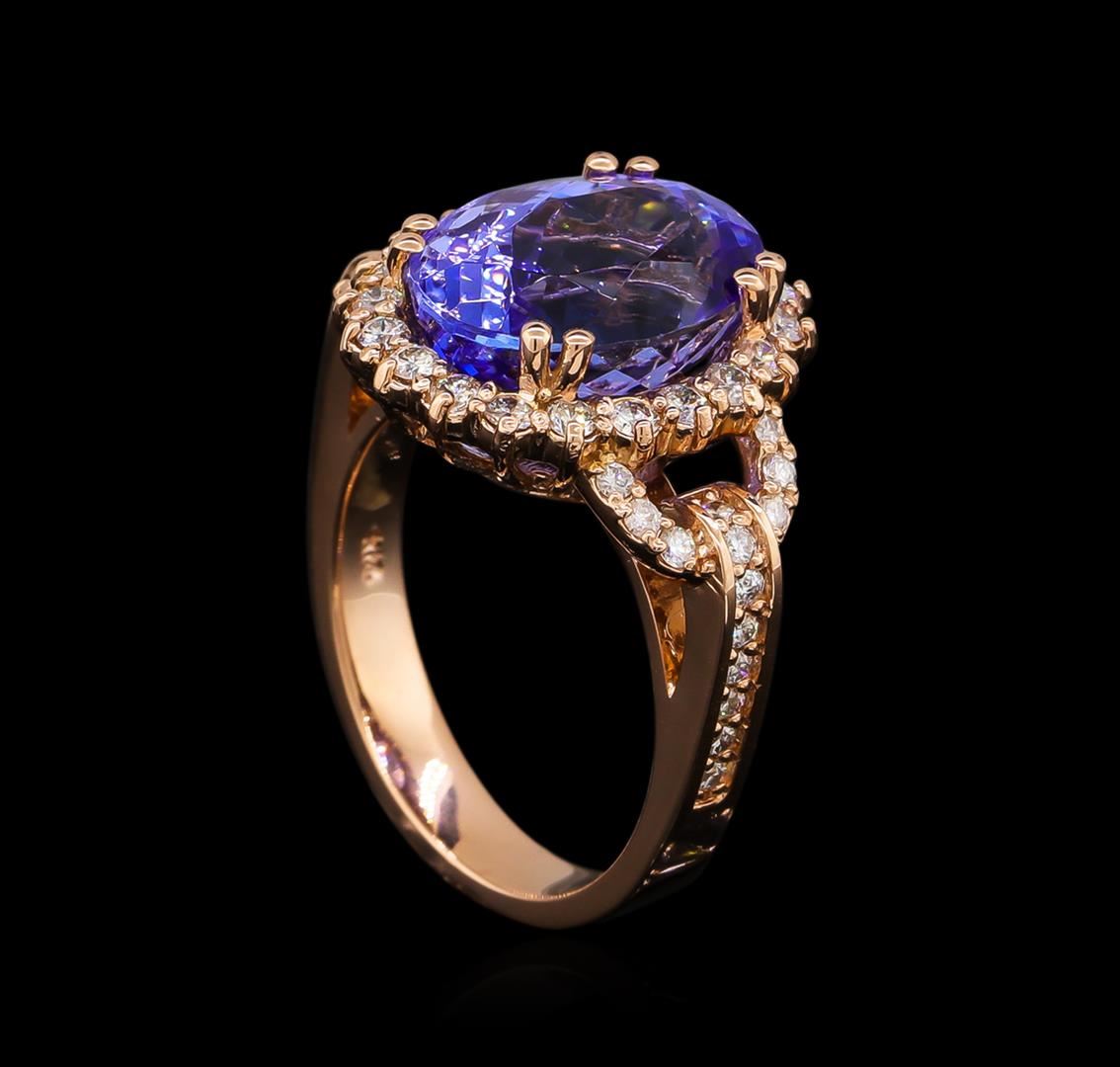 One electronically tested 14KT rose gold ladies cast tanzanite and diamond ring with a bright polish finish. The featured tanzanite is set within a diamond bezel supported by a ribbed under gallery and stylized diamond set shoulders, completed by a three millimeter wide band. Identified with markings of "K14". Condition is new, good workmanship. Containing: One prong set oval mixed cut natural tanzanite, measuring 12.80 x 9.80 x 8.00mm, approximate weight of 7.10ct., clarity is eye clean, type I, medium dark, very slightly grayish, bluish violet color, (GIA bV 6/3), cut is good. Transmitting light with no distortion, transparent. Colored Stone Grading Report attached. Graded in the setting. Tanzanite is a very rare gemstone that is only found in the country of Tanzania. Originally discovered in 1967. Tiffany & Company, named the stone Tanzanite. It is found in the Usumburu Mountains that border the Umba Valley of northern Tanzania. Tanzanite occurs in gray, brown, violet, blue, reddish-purple, & green. The gem is interesting because of its exceptional pleochroism. Rotated in different directions a tanzanite will exhibit multiple changes of color. Tanzanite has a low tolerance to ultrasonic cleaning, and should not be cleaned using this method. Forty-Eight prong set round brilliant cut diamonds approximate total weight of 48 Stones = 0.67ct. Graded in the setting. Clarity: SI-2 to I-2. Color: E - G. Total Weight of Colored Stones 7.10ct. Total Weight of Diamonds 0.67ct. Total Weight of Ring 7.74gm. AIG Appraised at $18,650.00.