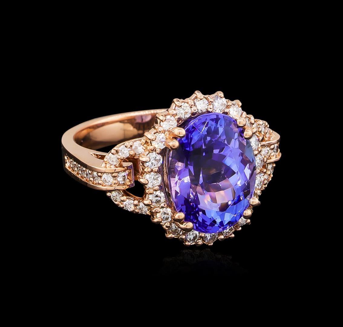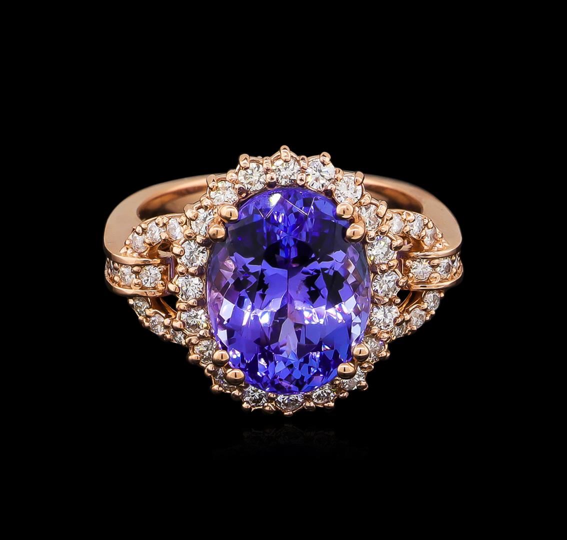 One electronically tested 14KT rose gold ladies cast tanzanite and diamond ring with a bright polish finish. The featured tanzanite is set within a diamond bezel supported by a ribbed under gallery and stylized diamond set shoulders, completed by a three millimeter wide band. Identified with markings of "K14". Condition is new, good workmanship. Containing: One prong set oval mixed cut natural tanzanite, measuring 12.80 x 9.80 x 8.00mm, approximate weight of 7.10ct., clarity is eye clean, type I, medium dark, very slightly grayish, bluish violet color, (GIA bV 6/3), cut is good. Transmitting light with no distortion, transparent. Colored Stone Grading Report attached. Graded in the setting. Tanzanite is a very rare gemstone that is only found in the country of Tanzania. Originally discovered in 1967. Tiffany & Company, named the stone Tanzanite. It is found in the Usumburu Mountains that border the Umba Valley of northern Tanzania. Tanzanite occurs in gray, brown, violet, blue, reddish-purple, & green. The gem is interesting because of its exceptional pleochroism. Rotated in different directions a tanzanite will exhibit multiple changes of color. Tanzanite has a low tolerance to ultrasonic cleaning, and should not be cleaned using this method. Forty-Eight prong set round brilliant cut diamonds approximate total weight of 48 Stones = 0.67ct. Graded in the setting. Clarity: SI-2 to I-2. Color: E - G. Total Weight of Colored Stones 7.10ct. Total Weight of Diamonds 0.67ct. Total Weight of Ring 7.74gm. AIG Appraised at $18,650.00.