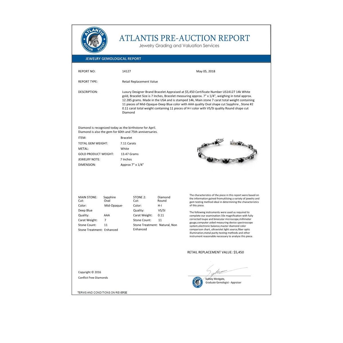 REF-82W4F -14127 ---- 7.11 CTW Blue Sapphire & Diamond Bracelet 14K White Gold ---- Luxury Designer Brand Bracelet Appraised at $5,450 Certificate Number US14127 14k White gold, Bracelet Size is 7 Inches, Bracelet measuring approx. 7" x 1/4", weighing in total approx. 12.285 grams. Made in the USA and is stamped 14k, Main stone 7 carat total weight containing 11 pieces of Mid-Opaque-Deep Blue color with AAA quality Oval shape cut Sapphire , Stone #2 0.11 carat total weight containing 11 pieces of H-I color with VS/SI quality Round shape cut Diamond