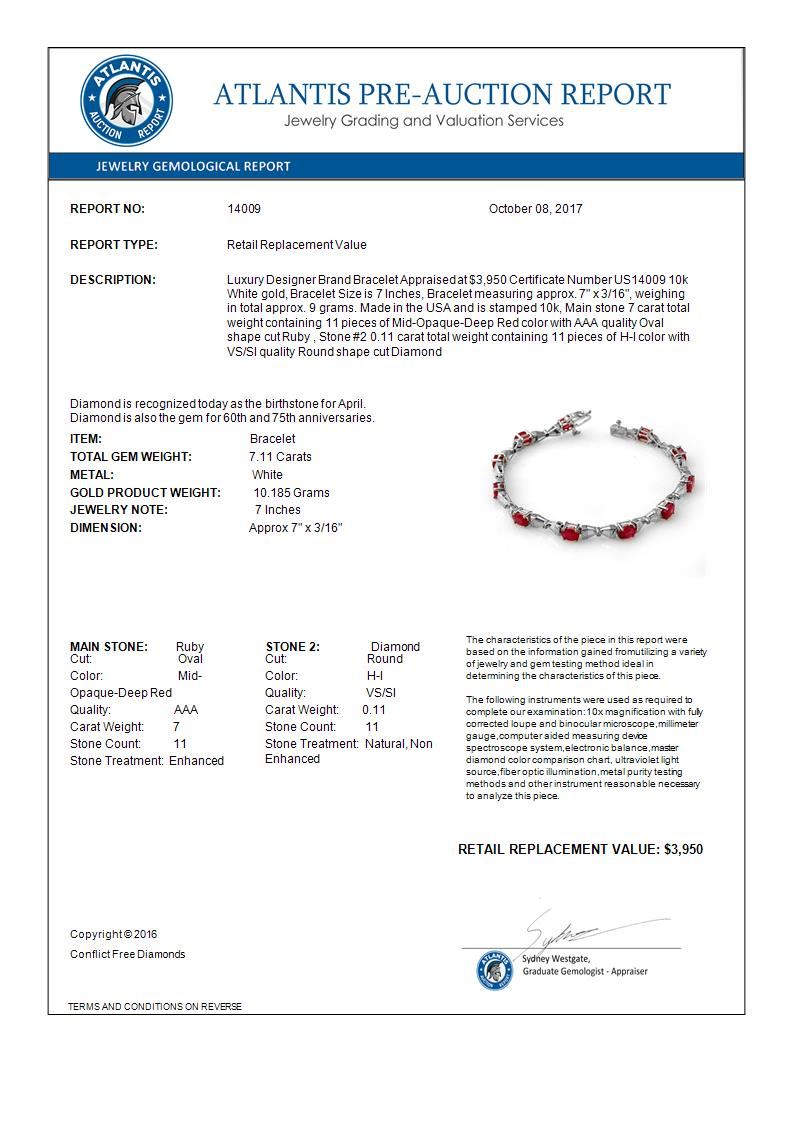14009 - REF-55N3A ---- 7.11 CTW Ruby & Diamond Bracelet 10K White Gold ---- Luxury Designer Brand Bracelet Appraised at $3,950 Certificate Number US14009 10k White gold, Bracelet Size is 7 Inches, Bracelet measuring approx. 7" x 3/16", weighing in total approx. 9 grams. Made in the USA and is stamped 10k, Main stone 7 carat total weight containing 11 pieces of Mid-Opaque-Deep Red color with AAA quality Oval shape cut Ruby , Stone #2 0.11 carat total weight containing 11 pieces of H-I color with VS/SI quality Round shape cut Diamond