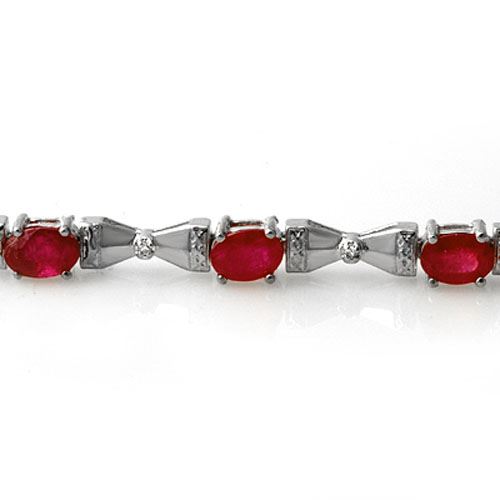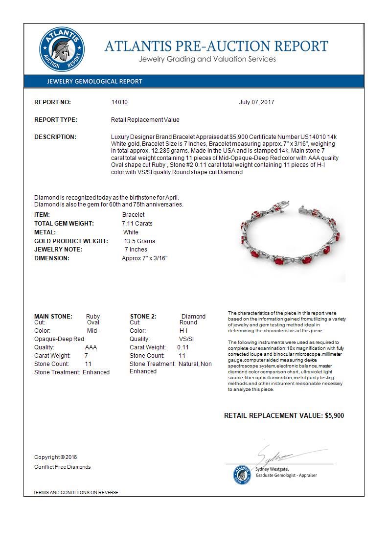 7.11 CTW Ruby & Diamond Bracelet 14K White Gold ---- Luxury Designer Brand Bracelet Appraised Retail Price at $5,900 ---- SKU Number US14010 14k White gold Bracelet Size is 7 Inches, Bracelet measuring approx. 7" x 3/16", weighing in total approx. 12.285 grams. Made in the USA and is stamped 14k, Main stone 7 carat total weight containing 11 pieces of Mid-Opaque-Deep Red color with AAA quality Oval shape cut Ruby , Stone #2 0.11 carat total weight containing 11 pieces of H-I color with VS/SI quality Round shape cut