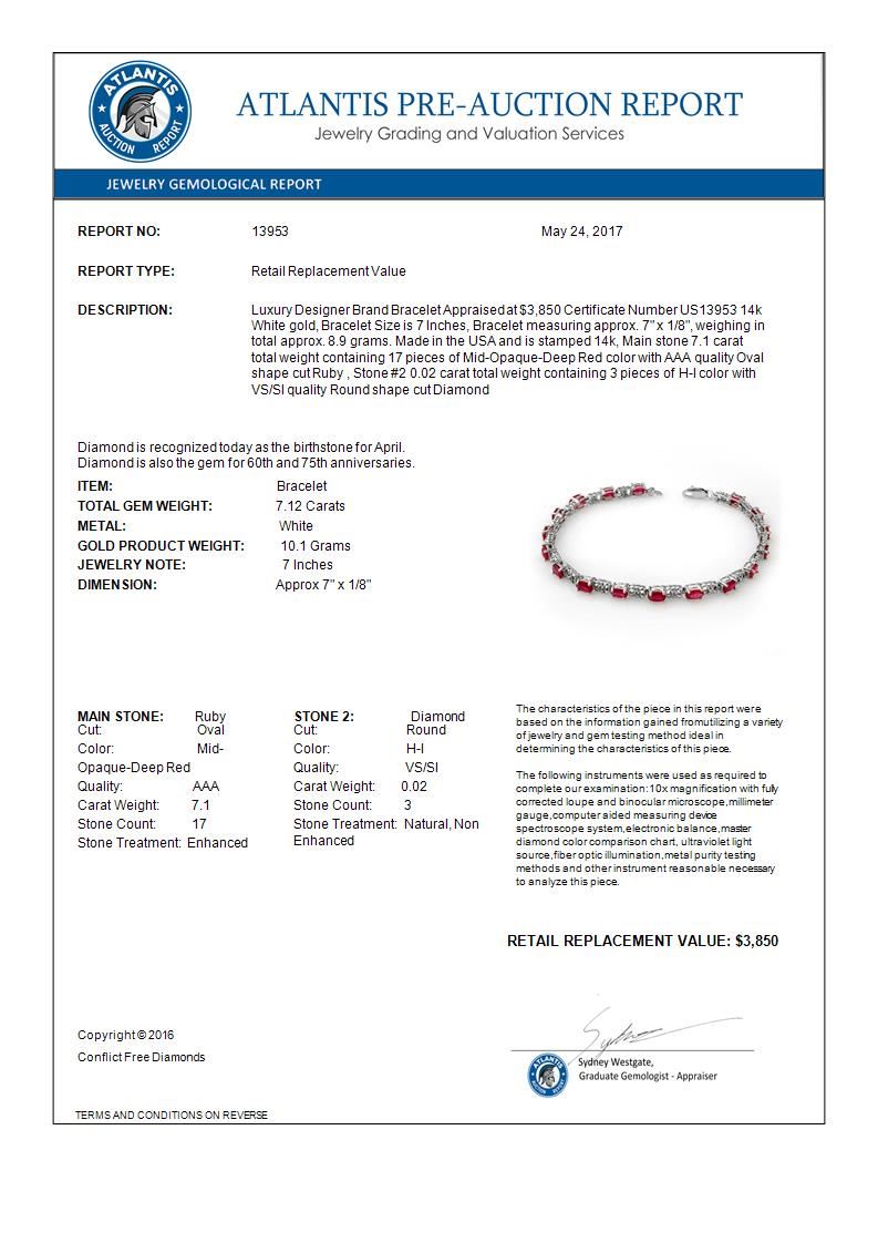 7.12 CTW Ruby & Diamond Bracelet 14K White Gold ---- Luxury Designer Brand Bracelet Appraised Retail Price at $3,850 ---- SKU Number US13953 14k White gold Bracelet Size is 7 Inches, Bracelet measuring approx. 7" x 1/8", weighing in total approx. 8.9 grams. Made in the USA and is stamped 14k, Main stone 7.1 carat total weight containing 17 pieces of Mid-Opaque-Deep Red color with AAA quality Oval shape cut Ruby , Stone #2 0.02 carat total weight containing 3 pieces of H-I color with VS/SI quality Round shape cut