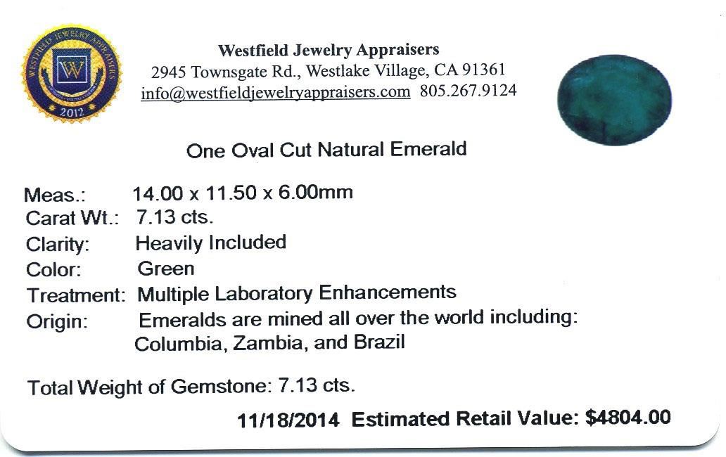 7.13ct. One Oval Cut Natural Emerald Westfield Appraised at $4,804.00.