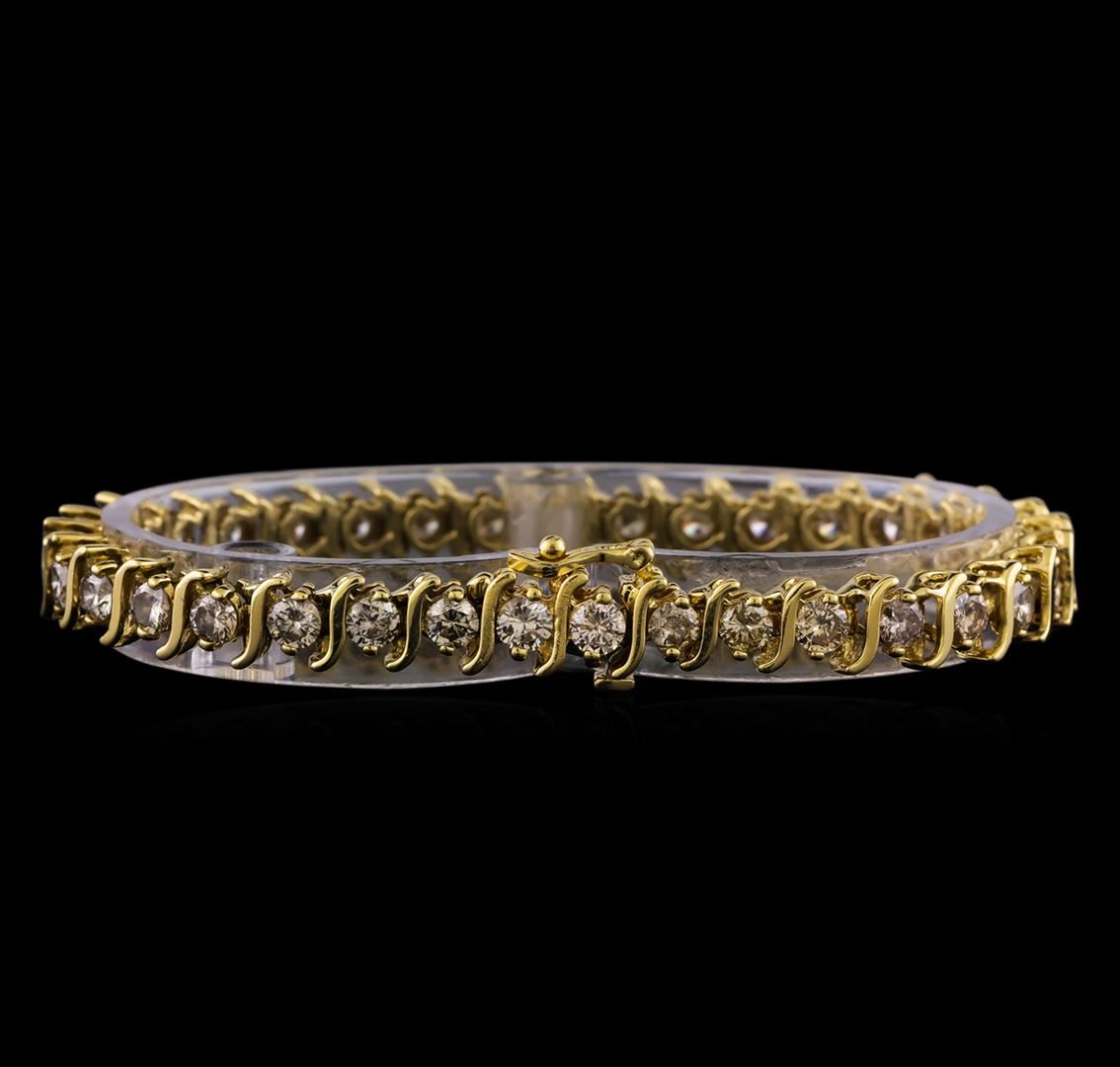 One electronically tested 14KT yellow gold ladies cast & assembled 'S' link style diamond tennis bracelet with a bright polish finish. Seven inch length bracelet composed of a flexible ribbon of diamonds, terminating in a concealed clasp with safety. Identified with markings of '14K'. Condition is good. Tennis bracelets & necklaces got their unusual name from an incident involving the U.S. professional tennis player Chris Evert during a tennis match in the 1980's. Evert had been wearing an expensive diamond bracelet, an inline string of individually set diamonds. Previously these bracelets were known as eternity bracelets. When the clasp snapped during play, she asked the officials to stop the tennis match until the bracelet could be found. Since that day, bracelets and necklaces featuring an inline string of diamonds have been called tennis bracelets and tennis necklaces. Containing: Thirty-Five prong set round brilliant cut diamonds, measuring 4.00 - 3.60 x 2.28mm (depth est.) approximate total weight of 35 Stones = 7.13ct. Faint brown secondary color throughout. Graded in the setting. Clarity SI-2 to I-2. Color: H - J. Total Weight of Diamonds 7.13ct.. Total Weight of Bracelet 19.79gm. AIG Appraised at $22,195.00.