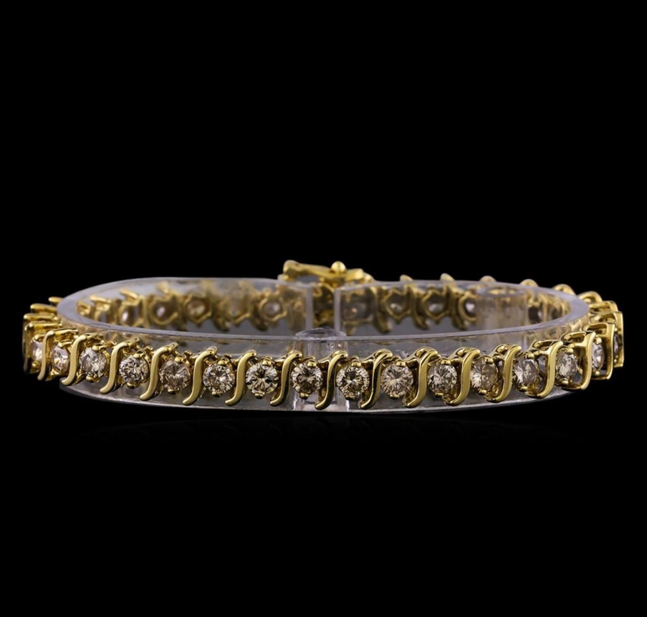 One electronically tested 14KT yellow gold ladies cast & assembled 'S' link style diamond tennis bracelet with a bright polish finish. Seven inch length bracelet composed of a flexible ribbon of diamonds, terminating in a concealed clasp with safety. Identified with markings of '14K'. Condition is good. Tennis bracelets & necklaces got their unusual name from an incident involving the U.S. professional tennis player Chris Evert during a tennis match in the 1980's. Evert had been wearing an expensive diamond bracelet, an inline string of individually set diamonds. Previously these bracelets were known as eternity bracelets. When the clasp snapped during play, she asked the officials to stop the tennis match until the bracelet could be found. Since that day, bracelets and necklaces featuring an inline string of diamonds have been called tennis bracelets and tennis necklaces. Containing: Thirty-Five prong set round brilliant cut diamonds, measuring 4.00 - 3.60 x 2.28mm (depth est.) approximate total weight of 35 Stones = 7.13ct. Faint brown secondary color throughout. Graded in the setting. Clarity SI-2 to I-2. Color: H - J. Total Weight of Diamonds 7.13ct.. Total Weight of Bracelet 19.79gm. AIG Appraised.