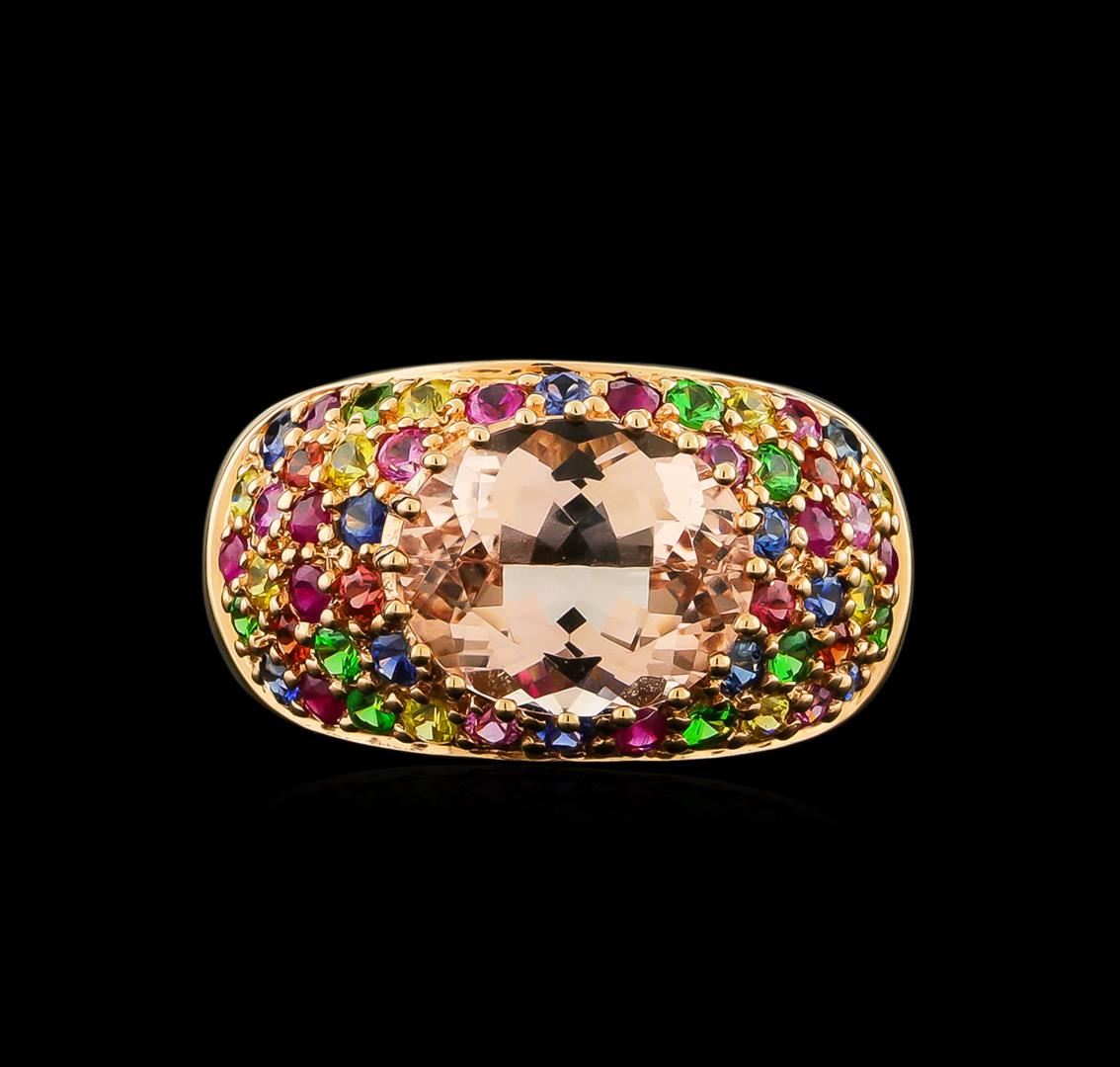 One electronically tested 14KT rose gold lady's cast fashion ring with a bright polish finish. The featured lady's ring has a shank measuring 3.85 millimeters wide. Identified with markings of "14K". Condition is new, good workmanship. Containing: One prong set oval modified brilliant cut natural morganite, measuring 11.45 x 9.80 x 6.79mm, approximate weight of 4.50ct., clarity is eye clean, type I, light, moderately strong, reddish orange color, (GIA rO 3/4), cut is very good. Transmitting light with no distortion, transparent. Colored gemstones are presumed to have been subjected to commonly used enhancement processes. Graded in the setting. Nine prong set round modified brilliant cut natural tsavorite garnets, measuring 2.10 - 2.00 x 1.33 mm, approximate total weight of 0.34ct., clarity is eye clean, type II, medium dark, moderately strong, slightly yellowish green color, (GIA slyG 6/4), cut is very good. Transmitting light with no distortion, transparent. Colored gemstones are presumed to have been subjected to commonly used enhancement processes. Graded in the setting. Eight prong set round modified brilliant cut natural rubies, measuring 2.10 - 2.00 x 1.27 mm, approximate total weight of 0.29ct., clarity is moderately included, type II, medium dark, very slightly brownish, red color, (GIA R 6/3), cut is good. Transmitting light somewhat diffusely, transparent to translucent. Colored gemstones are presumed to have been subjected to commonly used enhancement processes. Graded in the setting. Forty-three prong set round modified brilliant cut natural multi-color sapphires, measuring 2.10 - 2.00 x 1.33 mm, approximate total weight of 2.00ct., clarity is eye clean, cut is good. The featured sapphires range in color from blue to yellow to pink to orange. Transmitting light with no distortion, transparent. Colored gemstones are presumed to have been subjected to commonly used enhancement processes. Graded in the setting. Total Weight of Colored Stones 7.13ct. Total Weight of Ring 6.70gm GAS Appraised at $4,640.00.
