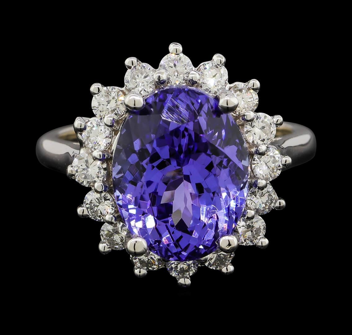 One electronically tested 14KT white gold lady's cast fashion ring with a basket halo with a bright polish finish. The featured lady's ring has a shank measuring 2.18 millimeters wide. Identified with markings of '14K'. Condition is new, good workmanship. Containing: One prong set oval modified brilliant cut natural tanzanite, measuring 12.55 x 9.78 x 7.85mm, (depth est.) 5%. bulge factor, approximate weight of 7.13ct., clarity is eye clean, medium dark, moderately strong, violetish blue color, (GIA vB 6/4), cut is excellent. Transmitting light with no distortion, transparent. Colored gemstones are presumed to have been subjected to commonly used enhancement processes. Graded in the setting. Sixteen prong set round brilliant cut diamonds, measuring 2.40 - 2.35 x 1.48mm (depth est.) approximate total weight of 16 Stones = 0.82ct. Graded in the setting. Clarity SI-1 to SI-2. Color: H - I Cut Good. Total Weight of Colored Stones 7.13ct.. Total Weight of Diamonds 0.82ct.. Total Weight of Ring 6.80gm. GAS Appraised at $13,170.00.