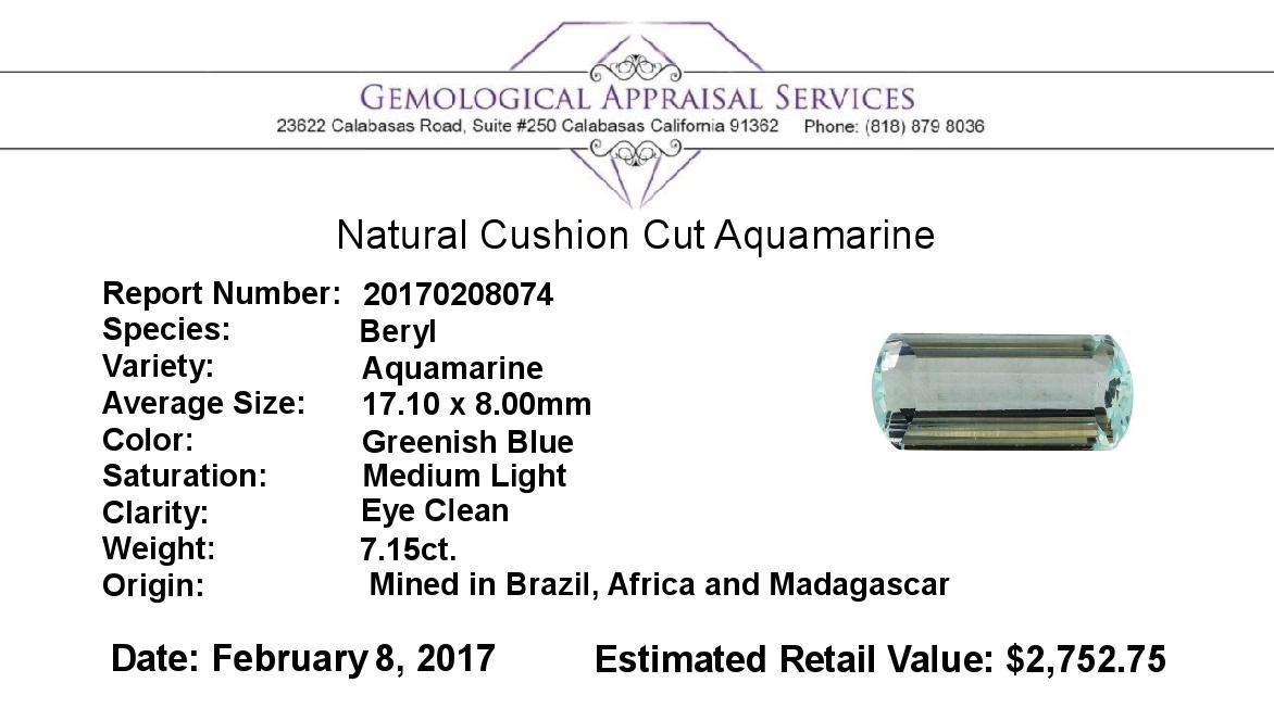 One natural cushion cut aquamarine with an exact weight of 7.15ct., clarity is eye clean, greenish blue, medium light. Gemological Appraisals Services estimates the retail value at $2752.75 GAS Appraised.