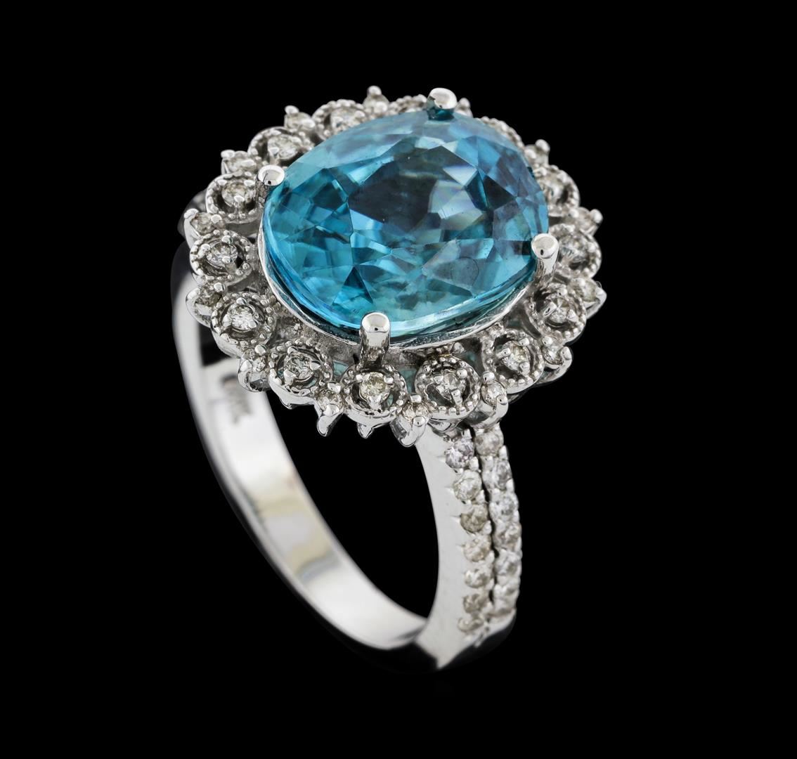 One electronically tested 14KT white gold lady's cast fashion ring with a staggered double basket halo with a bright polish with milgrain detailing finish. The featured lady's ring has a shank measuring 2.72 millimeters wide. Identified with markings of '14K'. Condition is new, good workmanship. Containing: One prong set oval modified mixed cut natural blue zircon, measuring 11.40 x 9.10 x 6.24mm, (depth est.) 12%. bulge factor, approximate weight of 7.16ct., clarity is slightly included, medium, moderately strong, green blue color, (GIA GB 5/4), cut is good. Transmitting light with a minimum of distortion, transparent. Colored gemstones are presumed to have been subjected to commonly used enhancement processes. Graded in the setting. Forty-Two prong set round brilliant cut diamonds, measuring 1.35 - 1.25 x 0.81mm (depth est.) approximate total weight of 42 Stones = 0.37ct. Graded in the setting. Clarity SI-1 to SI-2. Color: G - I Cut Good Fourteen prong set round brilliant cut diamonds, measuring 1.10 - 1.00 x 0.65mm (depth est.) approximate total weight of 14 Stones = 0.06ct. Graded in the setting. Clarity SI-1 to SI-2. Color: H - I Cut Good. Total Weight of Colored Stones 7.16ct.. Total Weight of Diamonds 0.43ct.. Total Weight of Ring 6.40gm. GAS Appraised at $6,130.00.