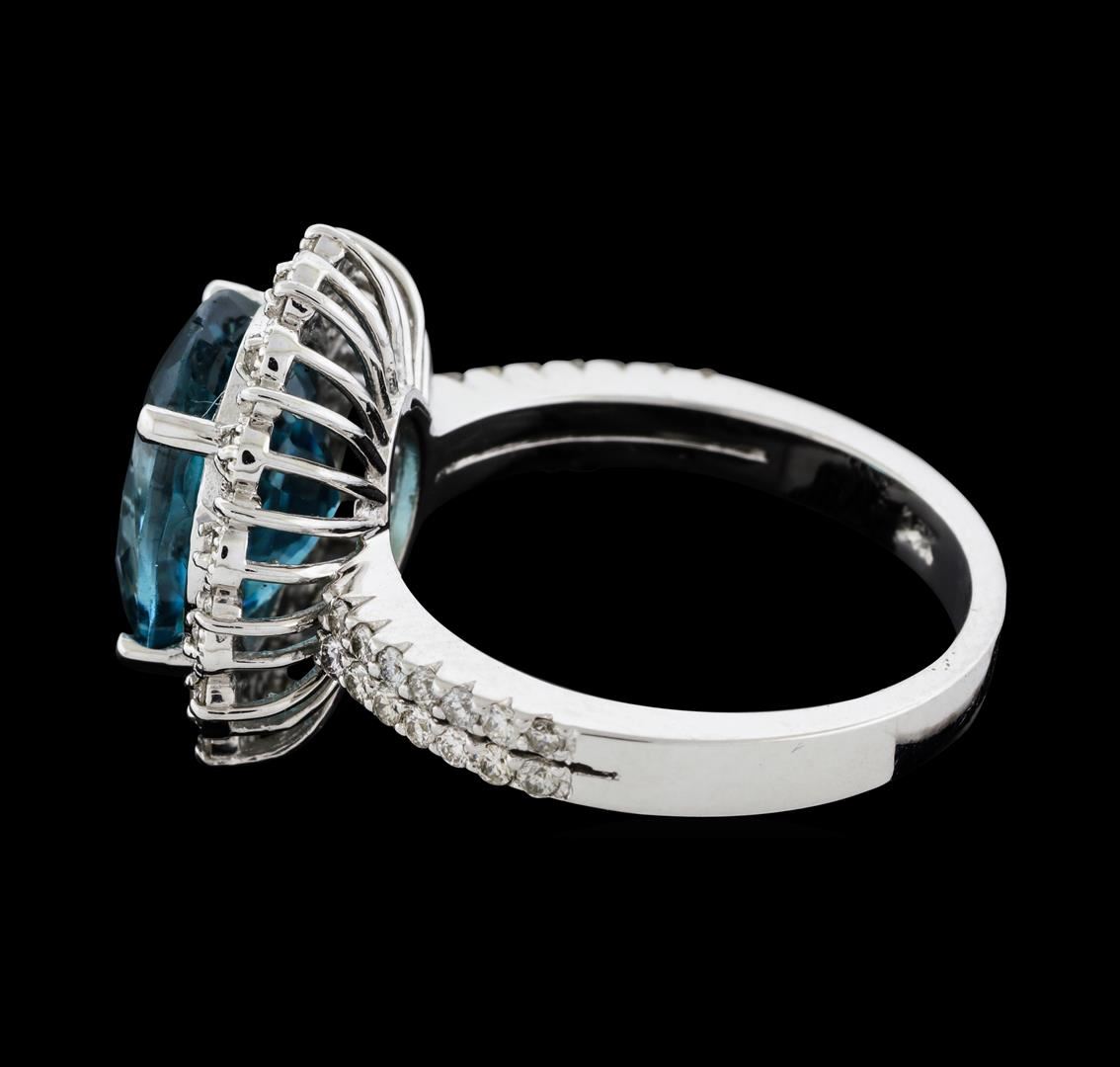 One electronically tested 14KT white gold lady's cast fashion ring with a staggered double basket halo with a bright polish with milgrain detailing finish. The featured lady's ring has a shank measuring 2.72 millimeters wide. Identified with markings of '14K'. Condition is new, good workmanship. Containing: One prong set oval modified mixed cut natural blue zircon, measuring 11.40 x 9.10 x 6.24mm, (depth est.) 12%. bulge factor, approximate weight of 7.16ct., clarity is slightly included, medium, moderately strong, green blue color, (GIA GB 5/4), cut is good. Transmitting light with a minimum of distortion, transparent. Colored gemstones are presumed to have been subjected to commonly used enhancement processes. Graded in the setting. Forty-Two prong set round brilliant cut diamonds, measuring 1.35 - 1.25 x 0.81mm (depth est.) approximate total weight of 42 Stones = 0.37ct. Graded in the setting. Clarity SI-1 to SI-2. Color: G - I Cut Good Fourteen prong set round brilliant cut diamonds, measuring 1.10 - 1.00 x 0.65mm (depth est.) approximate total weight of 14 Stones = 0.06ct. Graded in the setting. Clarity SI-1 to SI-2. Color: H - I Cut Good. Total Weight of Colored Stones 7.16ct.. Total Weight of Diamonds 0.43ct.. Total Weight of Ring 6.40gm. GAS Appraised at $6,130.00.