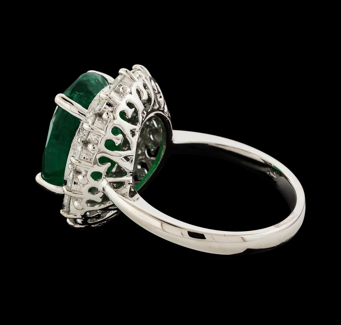 One electronically tested 14KT white gold lady's cast fashion ring with a basket halo with a bright polish finish. The featured lady's ring has a shank measuring 2.71 millimeters wide. Identified with markings of 'K14'. Condition is new, good workmanship. Containing: One prong set oval modified mixed cut natural emerald, measuring 13.70 x 10.80 x 7.31mm, (depth est.) 15%. bulge factor, approximate weight of 7.16ct., clarity is heavily included, medium dark, moderately strong, green color, (GIA G 6/4), cut is good. Transmitting light somewhat diffusely, semi-transparent to translucent. Naturally occurring internal & external characteristics are present. Indications of oil residue. Colored gemstones are presumed to have been subjected to commonly used enhancement processes. Graded in the setting. Fourteen prong set round brilliant cut diamonds, measuring 3.00 - 2.90 x 1.80mm (depth est.) approximate total weight of 14 Stones = 1.35ct. Graded in the setting. Clarity SI-1 to SI-2. Color: G - H Cut Good. Total Weight of Colored Stones 7.16ct.. Total Weight of Diamonds 1.35ct.. Total Weight of Ring 7.00gm GAS Appraised at $10,015.00.