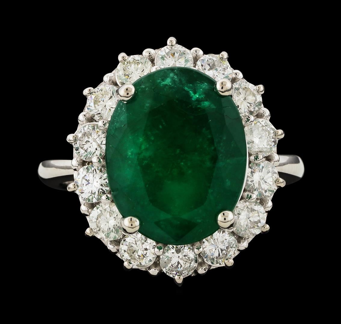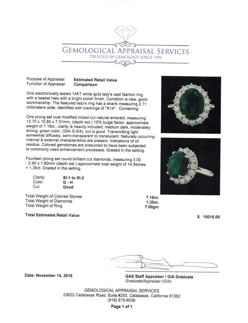 One electronically tested 14KT white gold lady's cast fashion ring with a basket halo with a bright polish finish. The featured lady's ring has a shank measuring 2.71 millimeters wide. Identified with markings of 'K14'. Condition is new, good workmanship. Containing: One prong set oval modified mixed cut natural emerald, measuring 13.70 x 10.80 x 7.31mm, (depth est.) 15%. bulge factor, approximate weight of 7.16ct., clarity is heavily included, medium dark, moderately strong, green color, (GIA G 6/4), cut is good. Transmitting light somewhat diffusely, semi-transparent to translucent. Naturally occurring internal & external characteristics are present. Indications of oil residue. Colored gemstones are presumed to have been subjected to commonly used enhancement processes. Graded in the setting. Fourteen prong set round brilliant cut diamonds, measuring 3.00 - 2.90 x 1.80mm (depth est.) approximate total weight of 14 Stones = 1.35ct. Graded in the setting. Clarity SI-1 to SI-2. Color: G - H Cut Good. Total Weight of Colored Stones 7.16ct.. Total Weight of Diamonds 1.35ct.. Total Weight of Ring 7.00gm GAS Appraised at $10,015.00.
