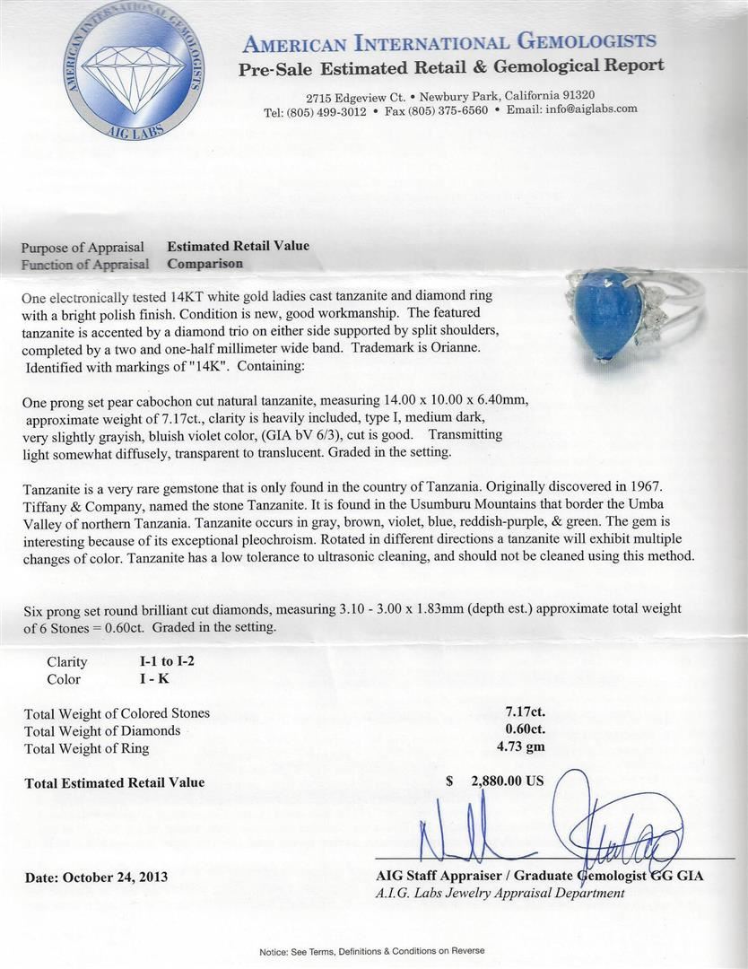 One electronically tested 14KT white gold ladies cast tanzanite and diamond ring with a bright polish finish. The featured tanzanite is accented by a diamond trio on either side supported by split shoulders, completed by a two and one-half millimeter wide band. Trademark is Orianne. Identified with markings of "14K". Condition is new, good workmanship. Containing: One prong set pear cabochon cut natural tanzanite, measuring 14.00 x 10.00 x 6.40mm, approximate weight of 7.17ct., clarity is heavily included, type I, medium dark, very slightly grayish, bluish violet color, (GIA bV 6/3), cut is good. Transmitting light somewhat diffusely, transparent to translucent. Graded in the setting. Tanzanite is a very rare gemstone that is only found in the country of Tanzania. Originally discovered in 1967. Tiffany & Company, named the stone Tanzanite. It is found in the Usumburu Mountains that border the Umba Valley of northern Tanzania. Tanzanite occurs in gray, brown, violet, blue, reddish-purple, & green. The gem is interesting because of its exceptional pleochroism. Rotated in different directions a tanzanite will exhibit multiple changes of color. Tanzanite has a low tolerance to ultrasonic cleaning, and should not be cleaned using this method. Six prong set round brilliant cut diamonds, measuring 3.10 - 3.00 x 1.83mm (depth est.) approximate total weight of 6 Stones = 0.60ct. Graded in the setting. Clarity: I-1 to I-2. Color: I - K. Total Weight of Colored Stones 7.17ct. Total Weight of Diamonds 0.60ct. AIG Appraised at $2,880.00.