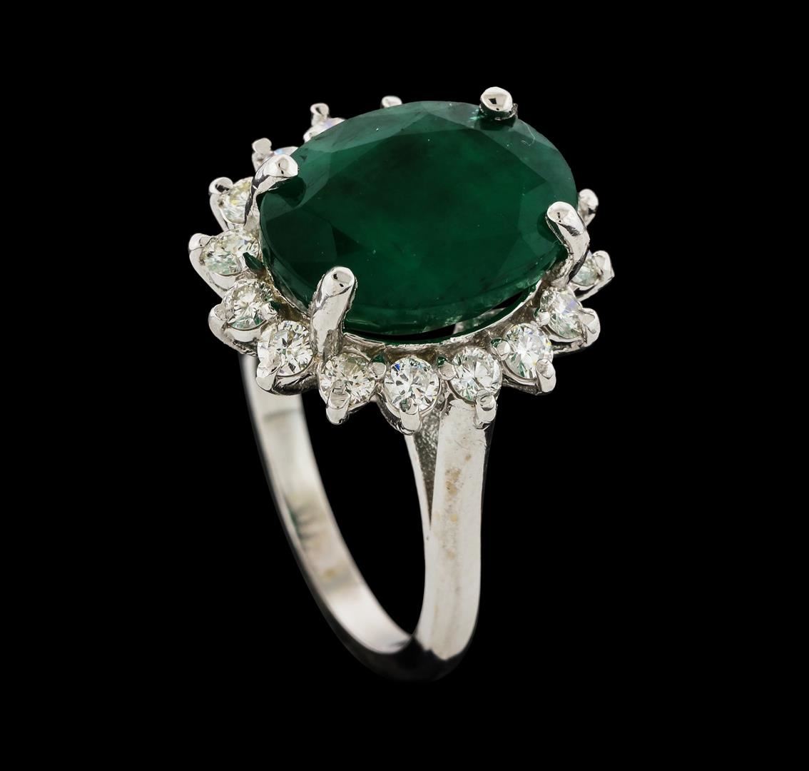 One electronically tested 14KT white gold lady's cast fashion ring with a basket halo with a bright polish finish. The featured lady's ring has a shank measuring 2.05 millimeters wide. Identified with markings of '14K'. Condition is new, good workmanship. Containing: One prong set oval modified mixed cut natural emerald, measuring 13.89 x 10.73 x 7.41mm, (depth est.) 14%. bulge factor, approximate weight of 7.18ct., clarity is heavily included, medium dark, moderately strong, green color, (GIA G 6/4), cut is good. Transmitting light somewhat diffusely, semi-transparent to translucent. Naturally occurring internal & external characteristics are present. Indications of oil residue. Colored gemstones are presumed to have been subjected to commonly used enhancement processes. Graded in the setting. Sixteen prong set round brilliant cut diamonds, measuring 2.40 - 2.30 x 1.41mm (depth est.) approximate total weight of 16 Stones = 0.76ct. Graded in the setting. Clarity SI-1 to SI-2. Color: G - H Cut Good. Total Weight of Colored Stones 7.18ct.. Total Weight of Diamonds 0.76ct.. Total Weight of Ring 7.00gm GAS Appraised at $10,400.00.