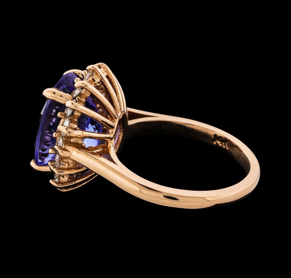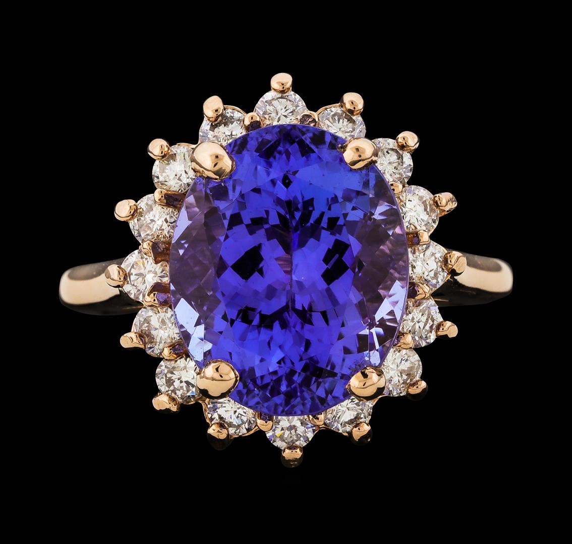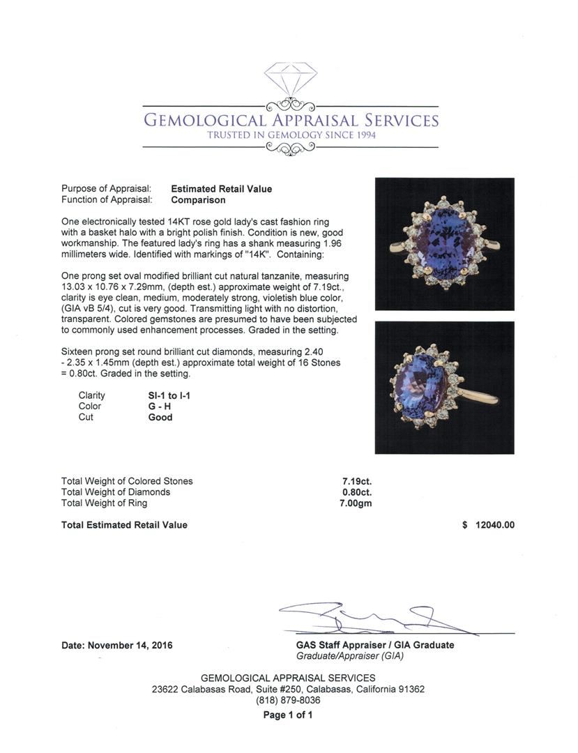 One electronically tested 14KT rose gold lady's cast fashion ring with a basket halo with a bright polish finish. The featured lady's ring has a shank measuring 1.96 millimeters wide. Identified with markings of '14K'. Condition is new, good workmanship. Containing: One prong set oval modified brilliant cut natural tanzanite, measuring 13.03 x 10.76 x 7.29mm, (depth est.) approximate weight of 7.19ct., clarity is eye clean, medium, moderately strong, violetish blue color, (GIA vB 5/4), cut is very good. Transmitting light with no distortion, transparent. Colored gemstones are presumed to have been subjected to commonly used enhancement processes. Graded in the setting. Sixteen prong set round brilliant cut diamonds, measuring 2.40 - 2.35 x 1.45mm (depth est.) approximate total weight of 16 Stones = 0.80ct. Graded in the setting. Clarity SI-1 to I-1. Color: G - H Cut Good. Total Weight of Colored Stones 7.19ct.. Total Weight of Diamonds 0.80ct.. Total Weight of Ring 7.00gm GAS Appraised at $12,040.00.