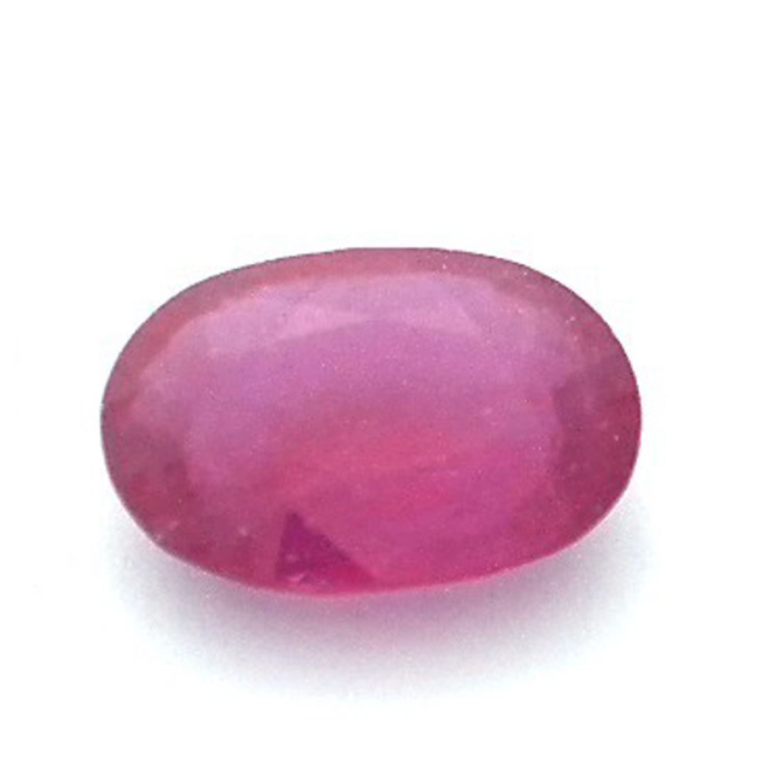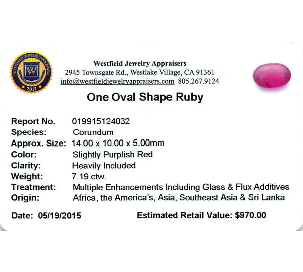 One oval mixed cut natural ruby, measuring 14.00 x 10.00 x 5.00mm, exact weight 7.19ct., clarity is heavily included, type II, medium dark, very slightly brownish, slightly purplish red color, (GIA slpR 6/3), cut is good. Transmitting light somewhat diffusely, translucent. Naturally occurring internal & external characteristics are present. Indications of laboratory high temperature heat treatment, with glass & flux additives. Ruby has a low tolerance to rhodium plating, repolishing the surface, & ultrasonic cleaning. Westfield Appraised at $970.00.