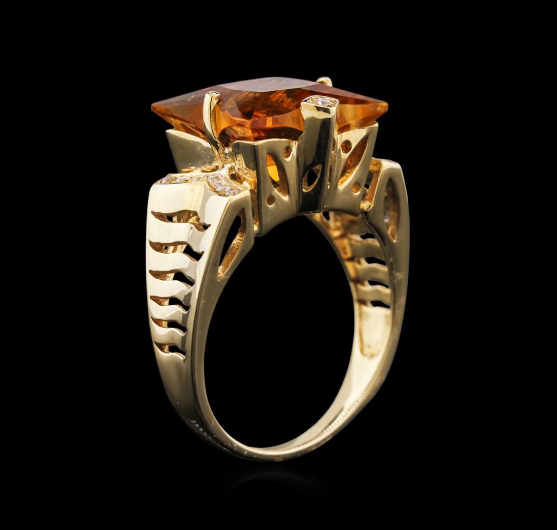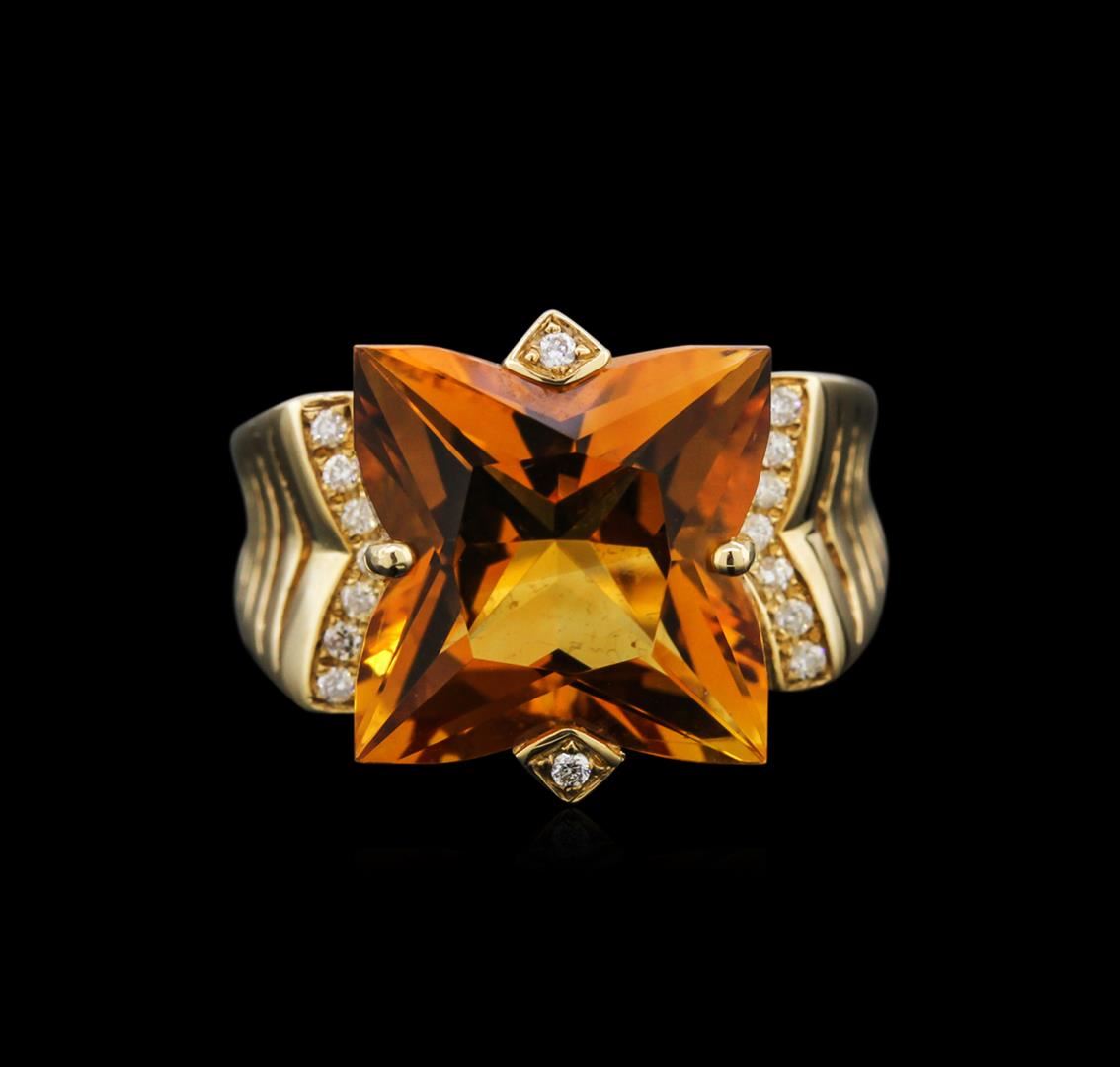 One 14KT Yellow Gold Citrine and Diamond Ring: One Citrine Quartz: Measures: 12.10 x 12.10 x 8.00 mm. Carat Weight: 7.20cts. Clarity: Eye Clean. Color: Yellowish Orange. Sixteen Round Brilliant Diamonds: Measures: 1.20 x 1.10 x 0.69 mm. Carat Weight: 0.10cts. Clarity: SI-2 to I-1. Color: G - I. Total Weight of Gemstones: 7.30cts. Total Weight of Item: 6.71gm. AIG Appraised at $1,570.00.