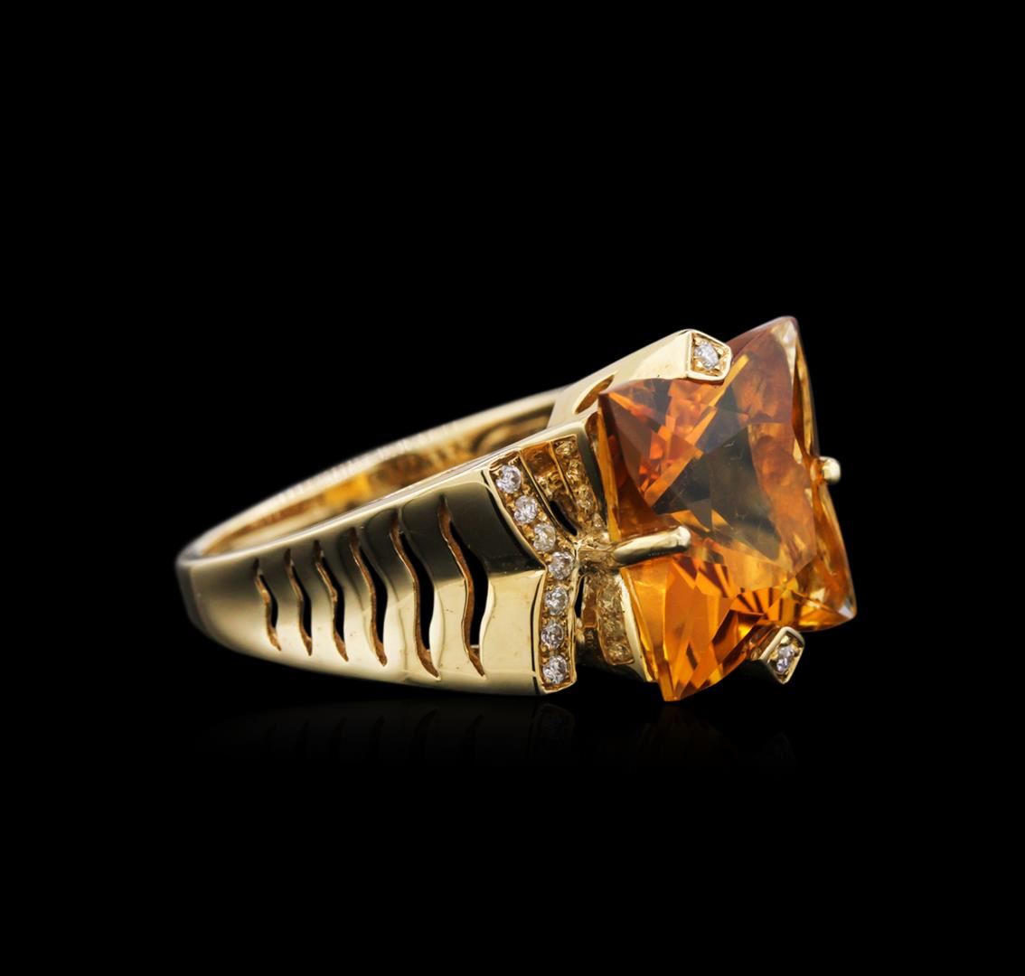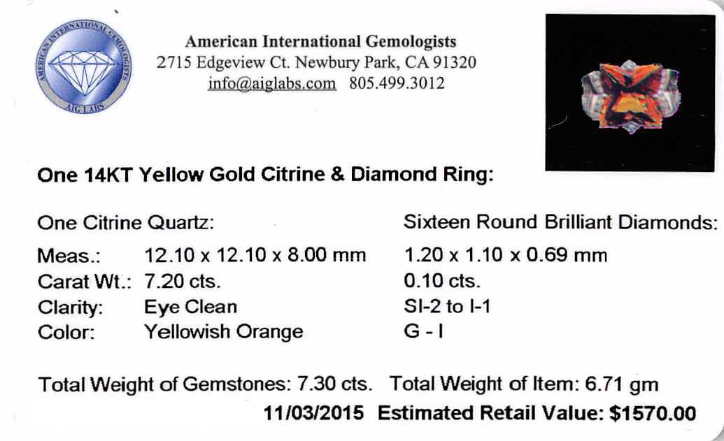 One 14KT Yellow Gold Citrine and Diamond Ring: One Citrine Quartz: Measures: 12.10 x 12.10 x 8.00 mm. Carat Weight: 7.20cts. Clarity: Eye Clean. Color: Yellowish Orange. Sixteen Round Brilliant Diamonds: Measures: 1.20 x 1.10 x 0.69 mm. Carat Weight: 0.10cts. Clarity: SI-2 to I-1. Color: G - I. Total Weight of Gemstones: 7.30cts. Total Weight of Item: 6.71gm. AIG Appraised at $1,570.00.