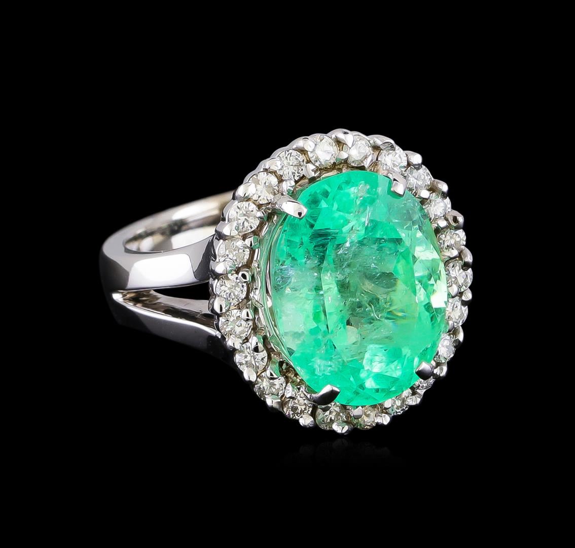 One electronically tested 14KT white gold lady's cast fashion ring with a split shank basket halo with a bright polish finish. The featured lady's ring has a shank measuring 3.77 millimeters in width. Identified with markings of "14K". Condition is new, good workmanship. Containing: One prong set oval modified brilliant cut natural emerald, measuring 13.95 x 10.80 x 8.30mm, (depth est.) approximate weight of 7.20ct., clarity is moderately included, medium light, moderately strong, very slightly bluish green color, (GIA vslbG 4/4), cut is good. Transmitting light with a minimum of distortion, transparent. Colored gemstones are presumed to have been subjected to commonly used enhancement processes. Indications of oil residue. Graded in the setting. Twenty-Two prong set round brilliant cut diamonds, measuring 1.90 - 1.80 x 1.11mm (depth est.) approximate total weight of 22 Stones = 0.51ct. Graded in the setting. Clarity: SI-1 to SI-2. Color: G - Good. Total Weight of Colored Stones 7.20ct. Total Weight of Diamonds 0.51ct. Total Weight of Ring 10.80gm GAS Appraised at $16,065.00.