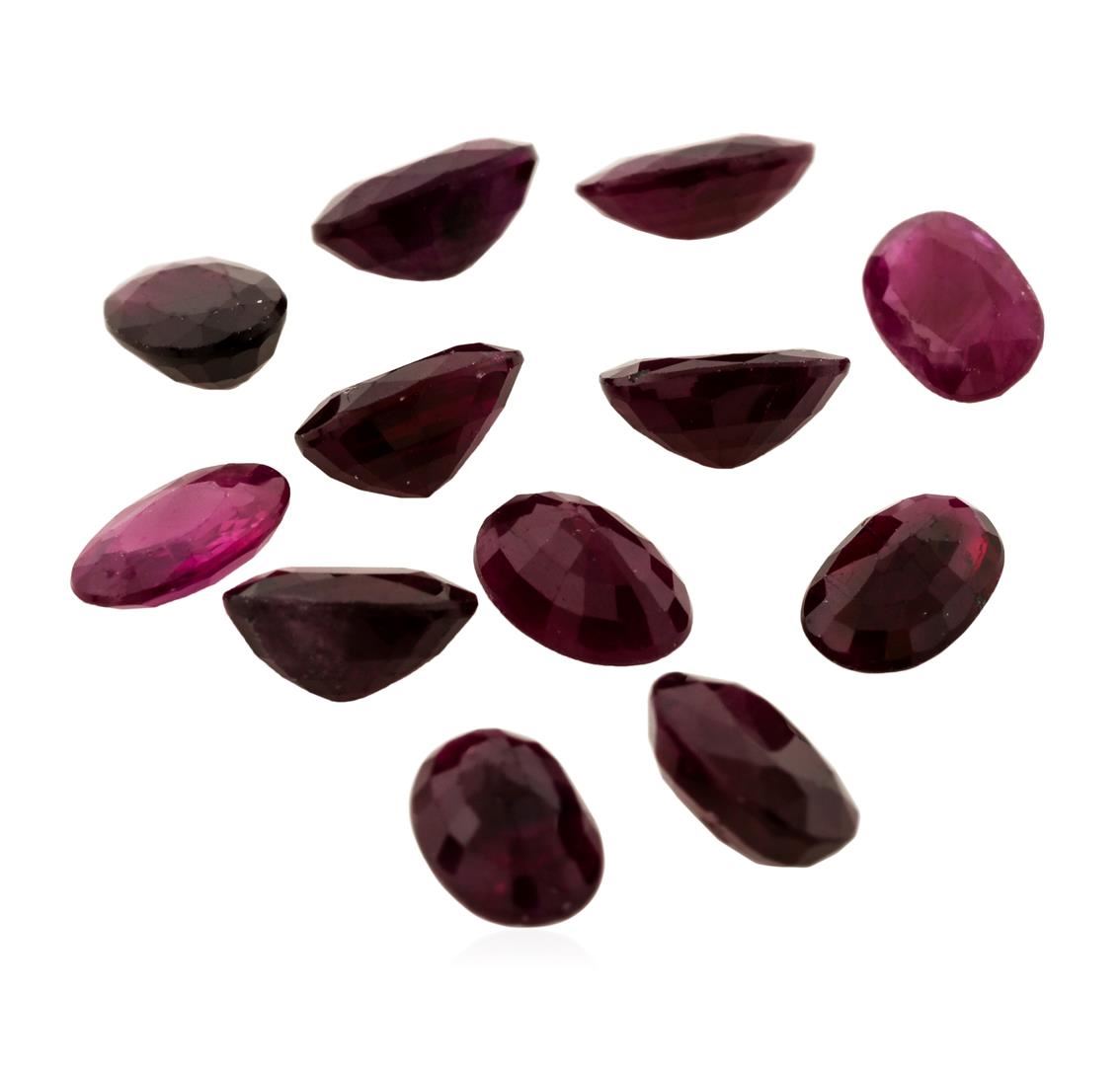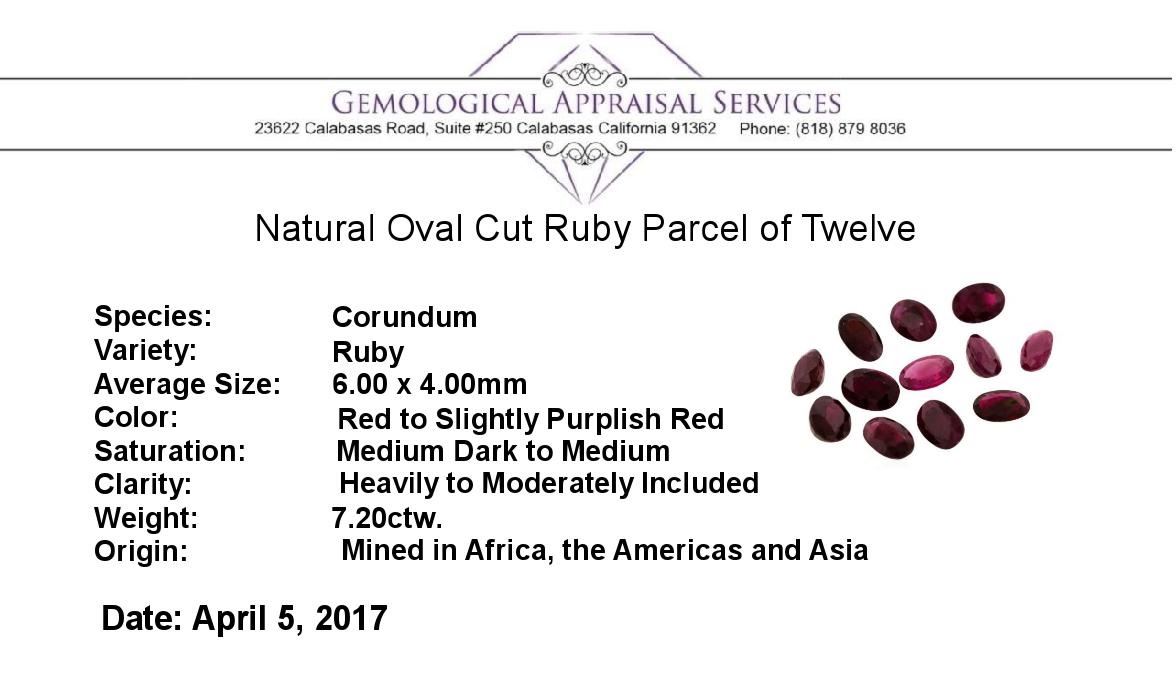 One natural oval cut ruby parcel of twelve with an exact weight of 7.20ctw., clarity is heavily to moderately included, red to slightly purplish red, medium dark to medium. Gemological Appraisals Services estimates the retail value at $1440 GAS Appraised.