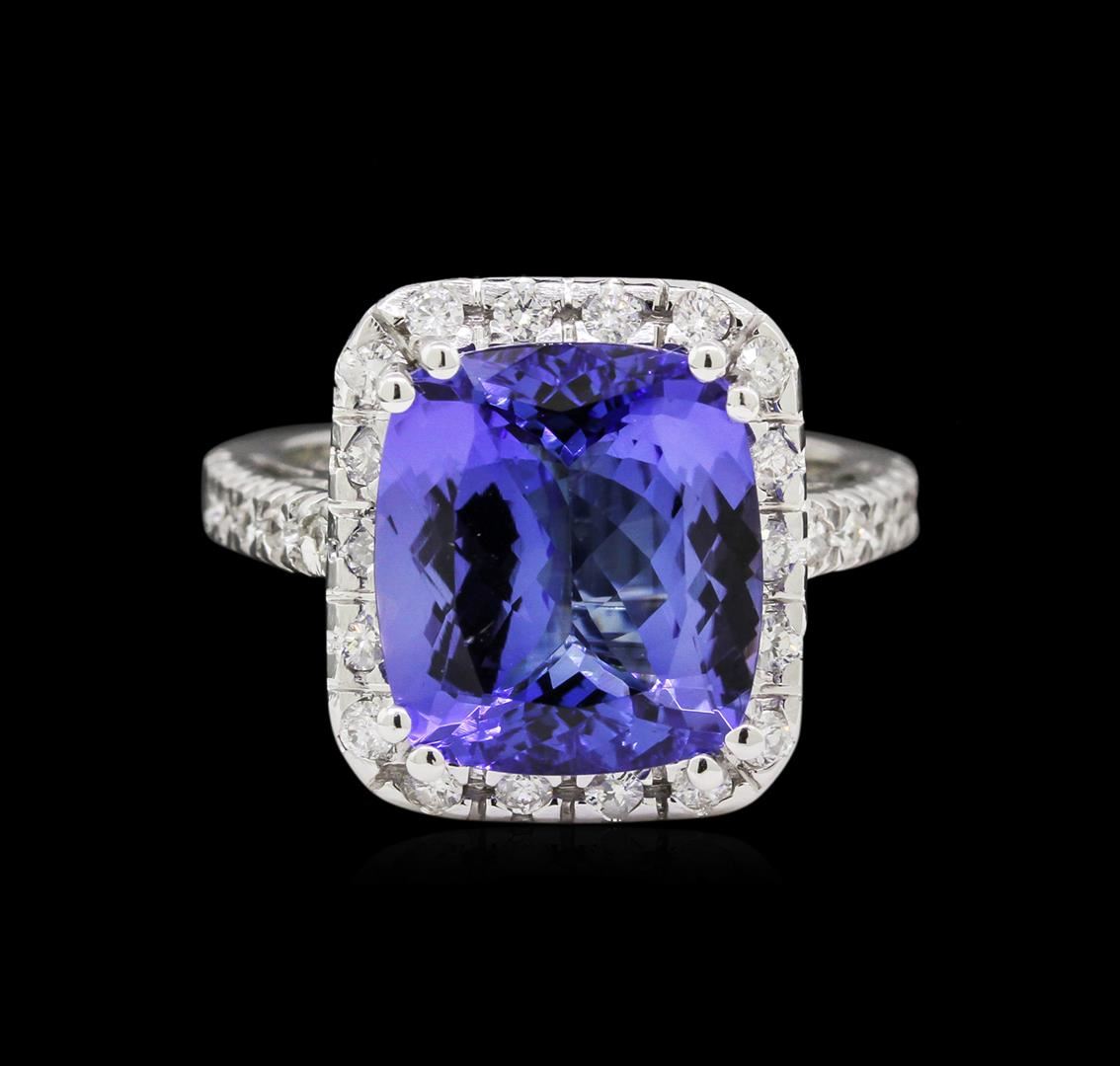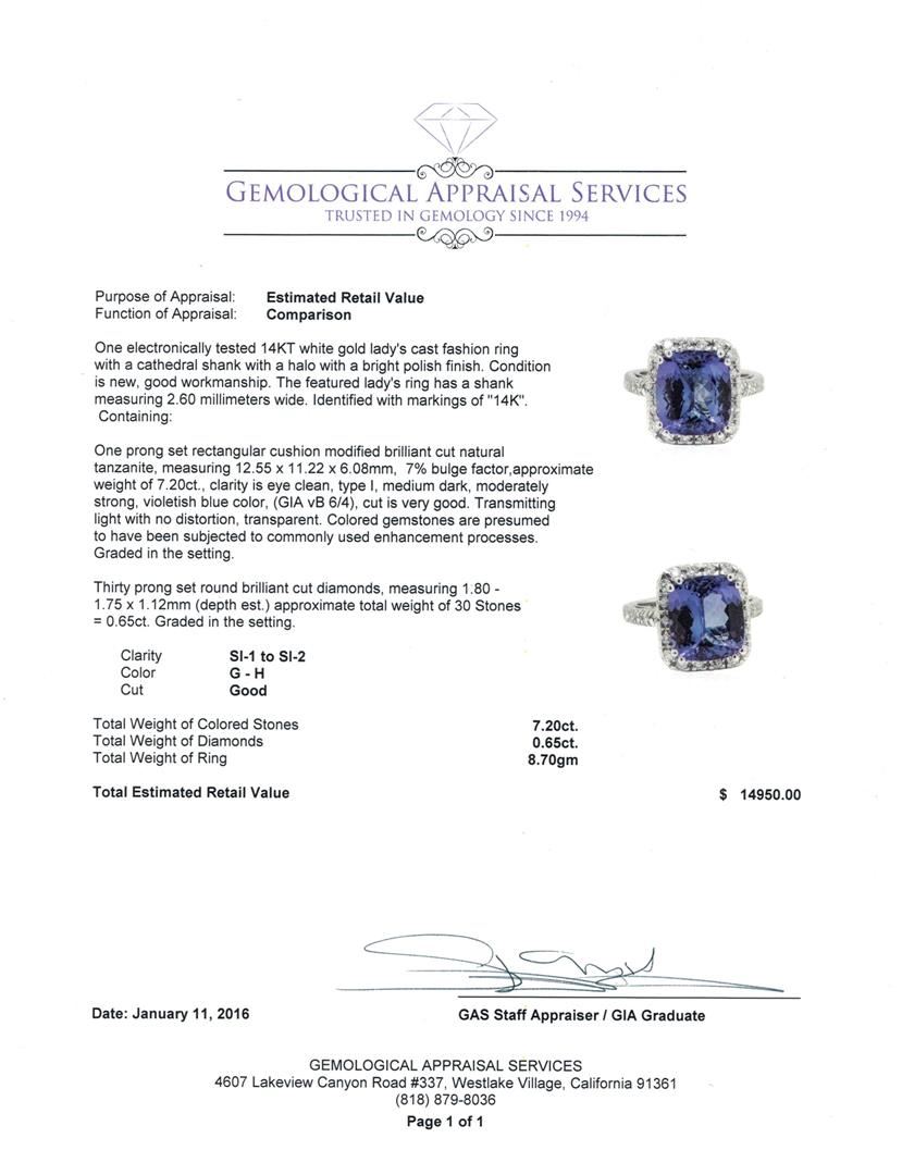One electronically tested 14KT white gold lady's cast fashion ring with a cathedral shank with a halo with a bright polish finish. The featured lady's ring has a shank measuring 2.60 millimeters wide. Identified with markings of "14K". Condition is new, good workmanship. Containing: One prong set rectangular cushion modified brilliant cut natural tanzanite, measuring 12.55 x 11.22 x 6.08mm, 7%. bulge factor, approximate weight of 7.20ct., clarity is eye clean, type I, medium dark, moderately strong, violetish blue color, (GIA vB 6/4), cut is very good. Transmitting light with no distortion, transparent. Colored gemstones are presumed to have been subjected to commonly used enhancement processes. Graded in the setting. Thirty prong set round brilliant cut diamonds, measuring 1.80 - 1.75 x 1.12mm (depth est.) approximate total weight of 30 Stones = 0.65ct. Graded in the setting. Clarity: SI-1 to SI-2. Color: G - Good. Total Weight of Colored Stones 7.20ct. Total Weight of Diamonds 0.65ct. Total Weight of Ring 8.70gm. GAS Appraised at $14,950.00.