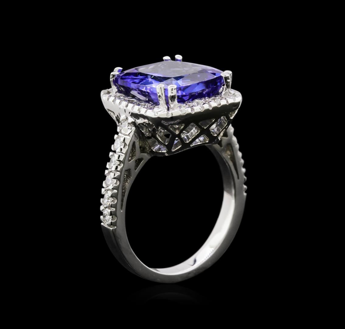 One electronically tested 14KT white gold lady's cast fashion ring with a cathedral shank with a halo with a bright polish finish. The featured lady's ring has a shank measuring 2.60 millimeters wide. Identified with markings of "14K". Condition is new, good workmanship. Containing: One prong set rectangular cushion modified brilliant cut natural tanzanite, measuring 12.55 x 11.22 x 6.08mm, 7%. bulge factor, approximate weight of 7.20ct., clarity is eye clean, type I, medium dark, moderately strong, violetish blue color, (GIA vB 6/4), cut is very good. Transmitting light with no distortion, transparent. Colored gemstones are presumed to have been subjected to commonly used enhancement processes. Graded in the setting. Thirty prong set round brilliant cut diamonds, measuring 1.80 - 1.75 x 1.12mm (depth est.) approximate total weight of 30 Stones = 0.65ct. Graded in the setting. Clarity: SI-1 to SI-2. Color: G - Good. Total Weight of Colored Stones 7.20ct. Total Weight of Diamonds 0.65ct. Total Weight of Ring 8.70gm. GAS Appraised at $14,950.00.