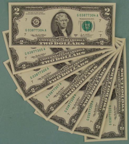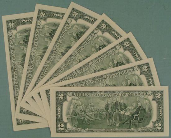 7) 2003-A $2 Notes with consecutive serial numbers * * Mint mark: G (Chicago) * Grade: Crisp Uncirculated * * Note: Bills shown may look different from those you receive