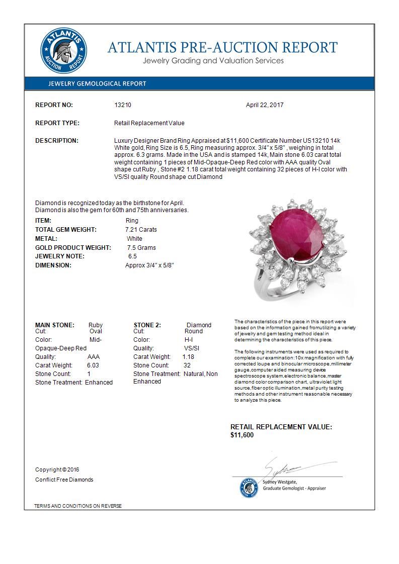 7.21 CTW Ruby & Diamond Ring 14K White Gold ---- Luxury Designer Brand Ring Appraised Retail Price at $11,600 ---- SKU Number US13210 14k White gold Ring Size is 6.5, Ring measuring approx. 3/4" x 5/8" , weighing in total approx. 6.3 grams. Made in the USA and is stamped 14k, Main stone 6.03 carat total weight containing 1 pieces of Mid-Opaque-Deep Red color with AAA quality Oval shape cut Ruby , Stone #2 1.18 carat total weight containing 32 pieces of H-I color with VS/SI quality Round shape cut