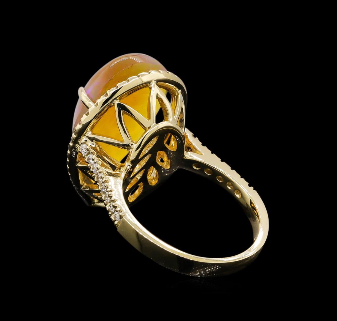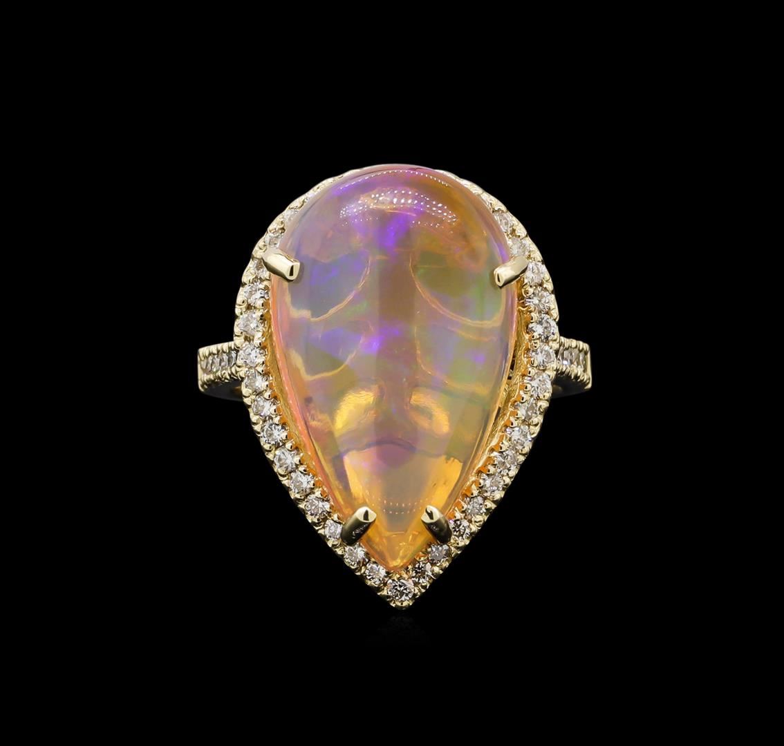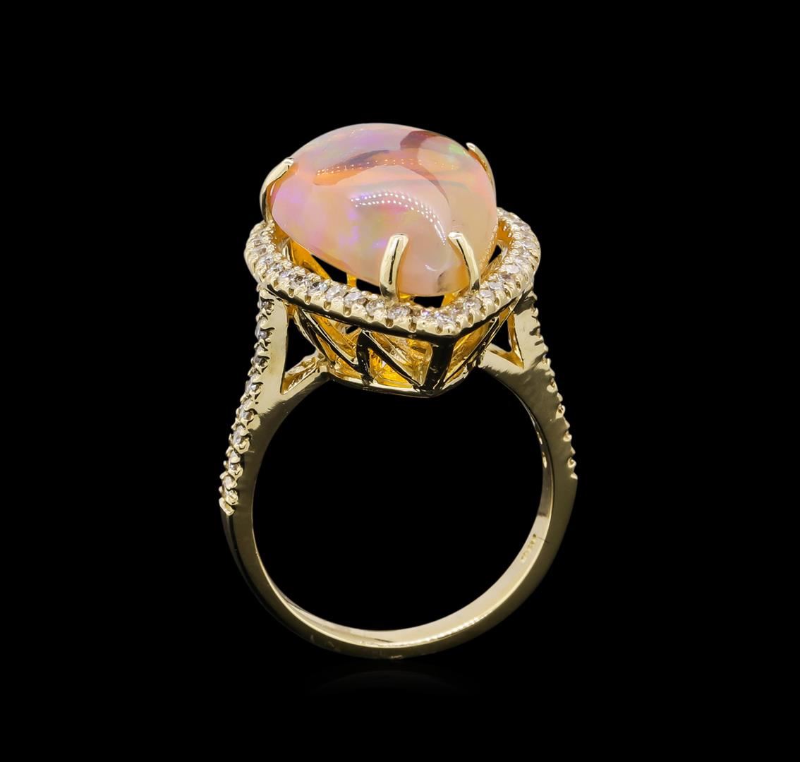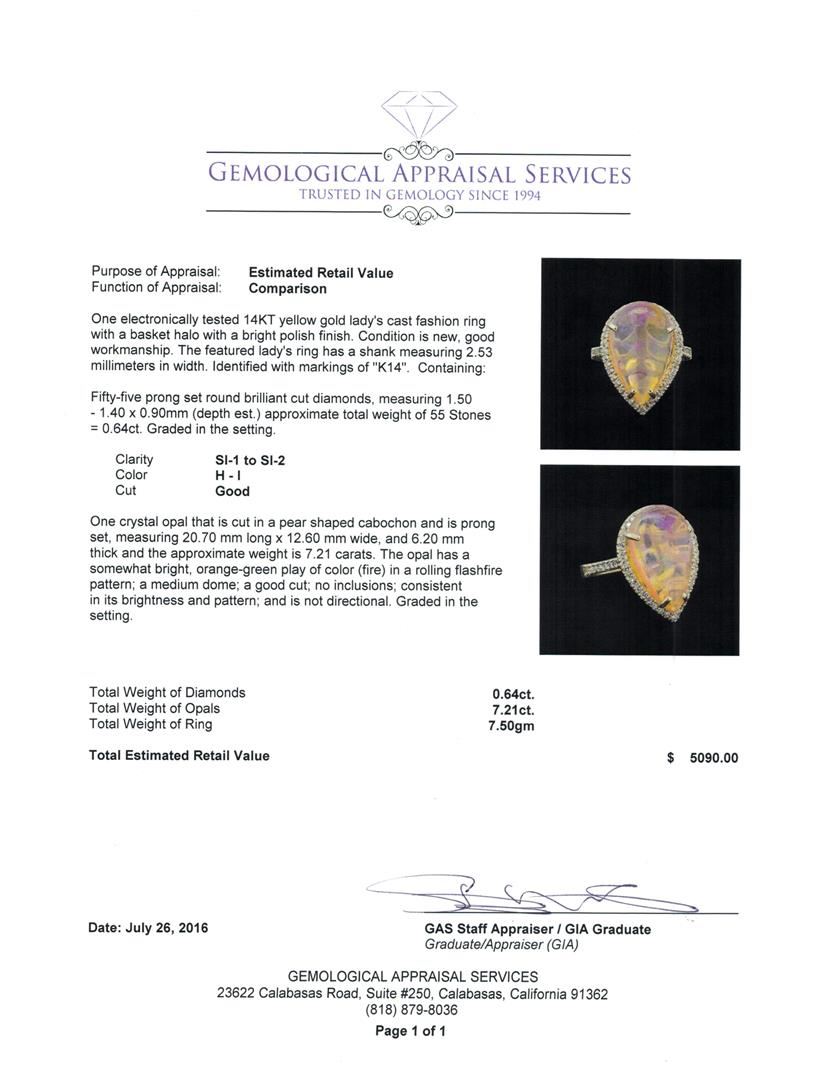 One electronically tested 14KT yellow gold lady's cast fashion ring with a basket halo with a bright polish finish. The featured lady's ring has a shank measuring 2.53 millimeters in width. Identified with markings of 'K14'. Condition is new, good workmanship. Containing: Fifty-Five prong set round brilliant cut diamonds, measuring 1.50 - 1.40 x 0.90mm (depth est.) approximate total weight of 55 Stones = 0.64ct. Graded in the setting. Clarity SI-1 to SI-2. Color: H - I Cut Good One crystal opal that is cut in a pear shaped cabochon and is prong set, measuring 20.70 mm long x 12.60 mm wide, and 6.20 mm thick and the approximate weight is 7.21 carats. The opal has a somewhat bright, orange-green play of color (fire) in a rolling flashfire pattern; a medium dome; a good cut; no inclusions; consistent in its brightness and pattern; and is not directional. Graded in the setting.. Total Weight of Diamonds 0.64ct.. Total Weight of Opals 7.21ct.. Total Weight of Ring 7.50gm. GAS Appraised at $5,090.00.