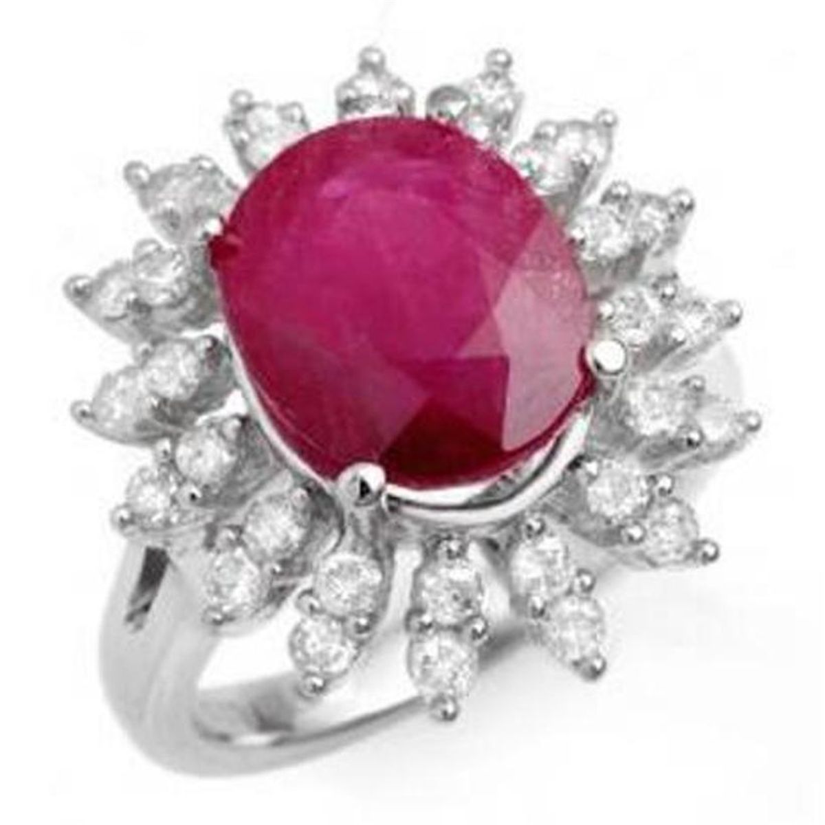 Diamond: 32 Round cut @ 1.18 ctw Clarity: SI-I Color: H-K Gemstone: Natural Ruby Gemstone color: RedGemstone quality: Good-to-Very Good Gemstone Cut & Weight: 1 Oval cut @ 6.03 ctw Metal Purity & Color : 14K Gold-White Gold weight: 6.30 grams Ring size (US): 6.5Dimension: Approx. 3/4" x 5/8"