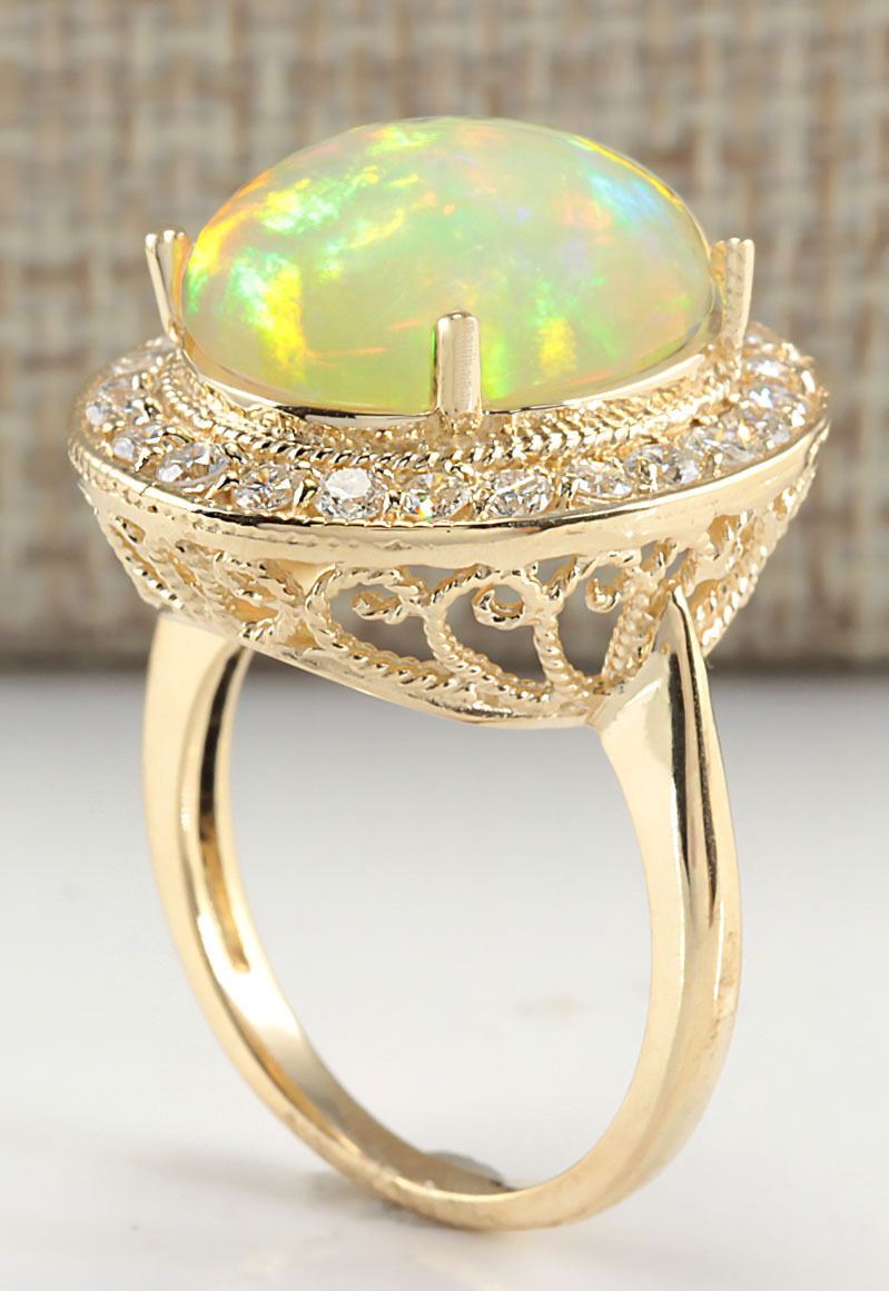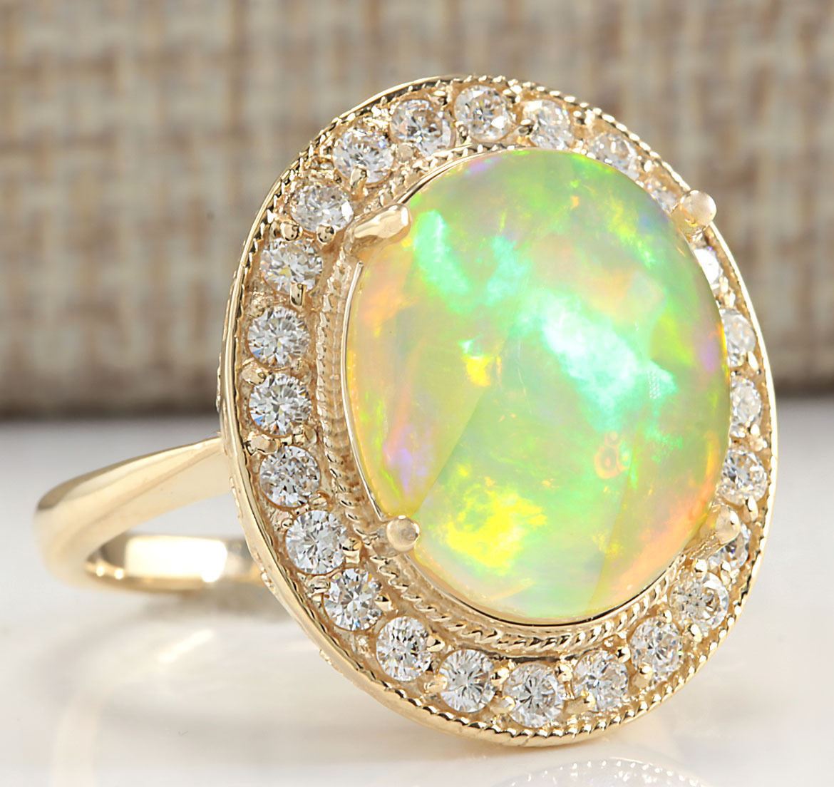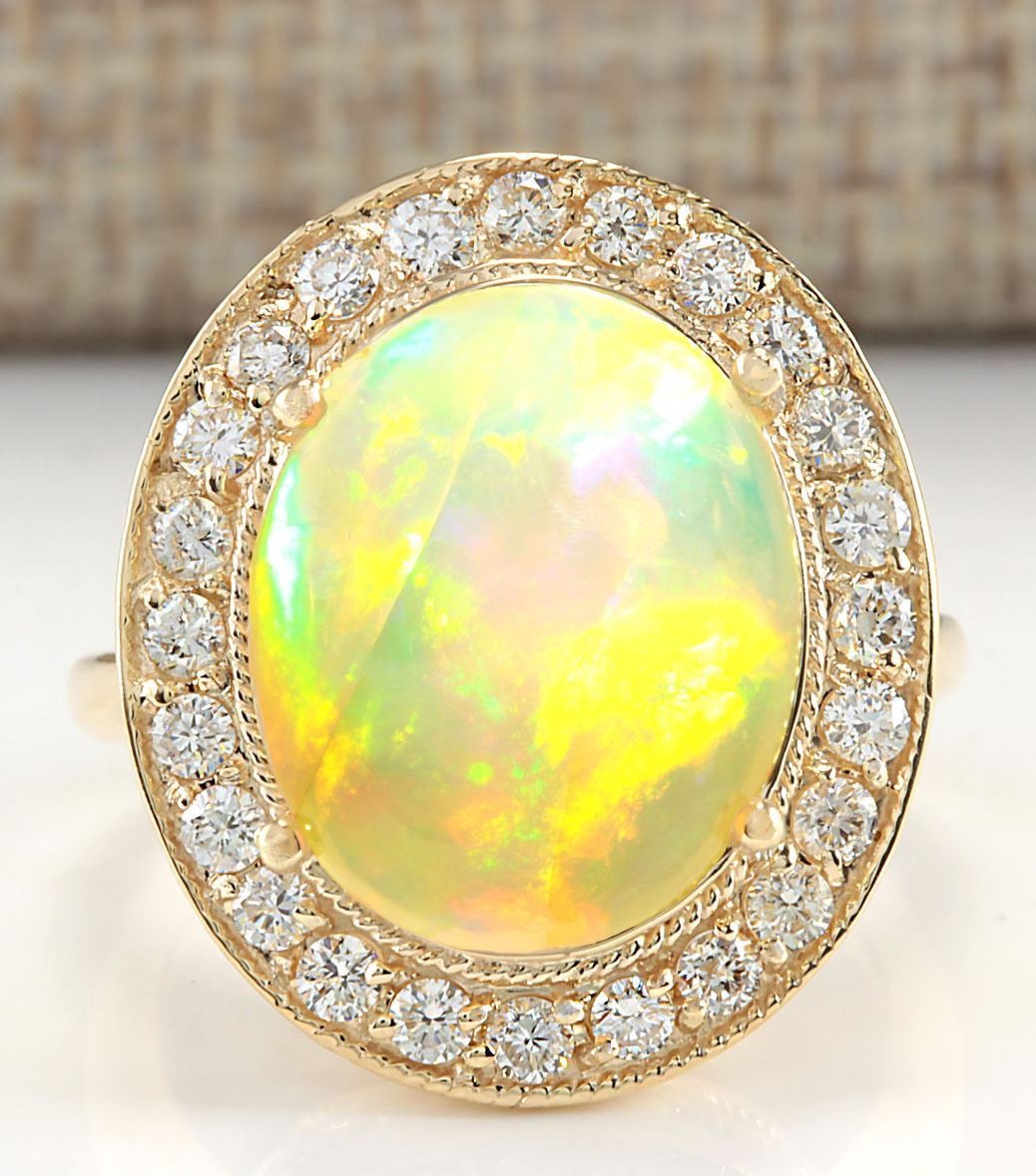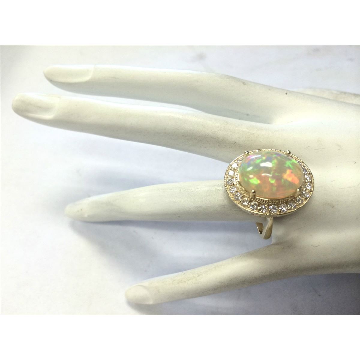 Stamped: 14K Ring Size: 6.75 Total Ring Weight: 7 Grams Diamond Weight: Total natural diamond weight is .75carat. SI1-SI2 clarity / G-H color Gemstone Weight: Total Natural ETHIOPIAN Opal Weight is 6.46ctw (Measures: 15.50x12.62mm) Face Measures: 21.69x18.67mm Main stone color: Multicolor [SKU:702048]