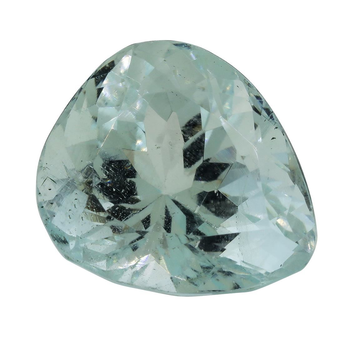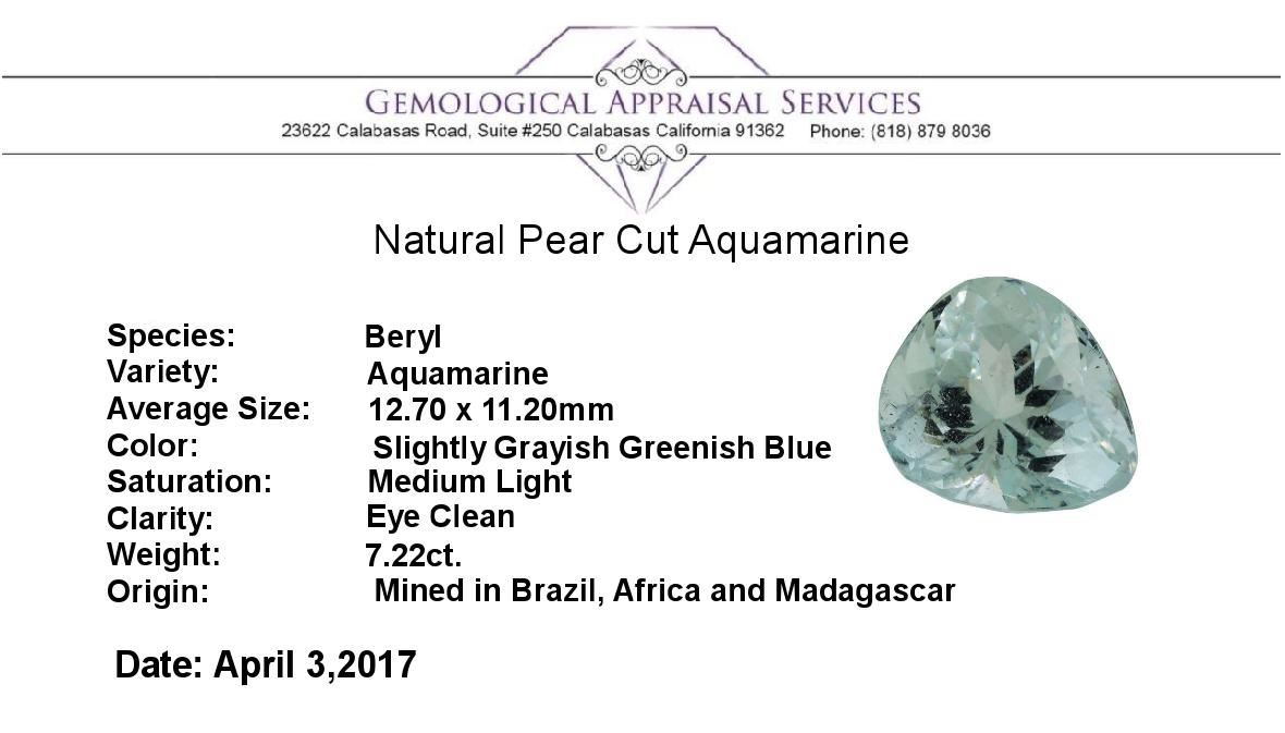 One natural pear cut aquamarine with an exact weight of 7.22ct., clarity is eye clean, slightly grayish greenish blue, medium light. Gemological Appraisals Services estimates the retail value at $2274.3 GAS Appraised.
