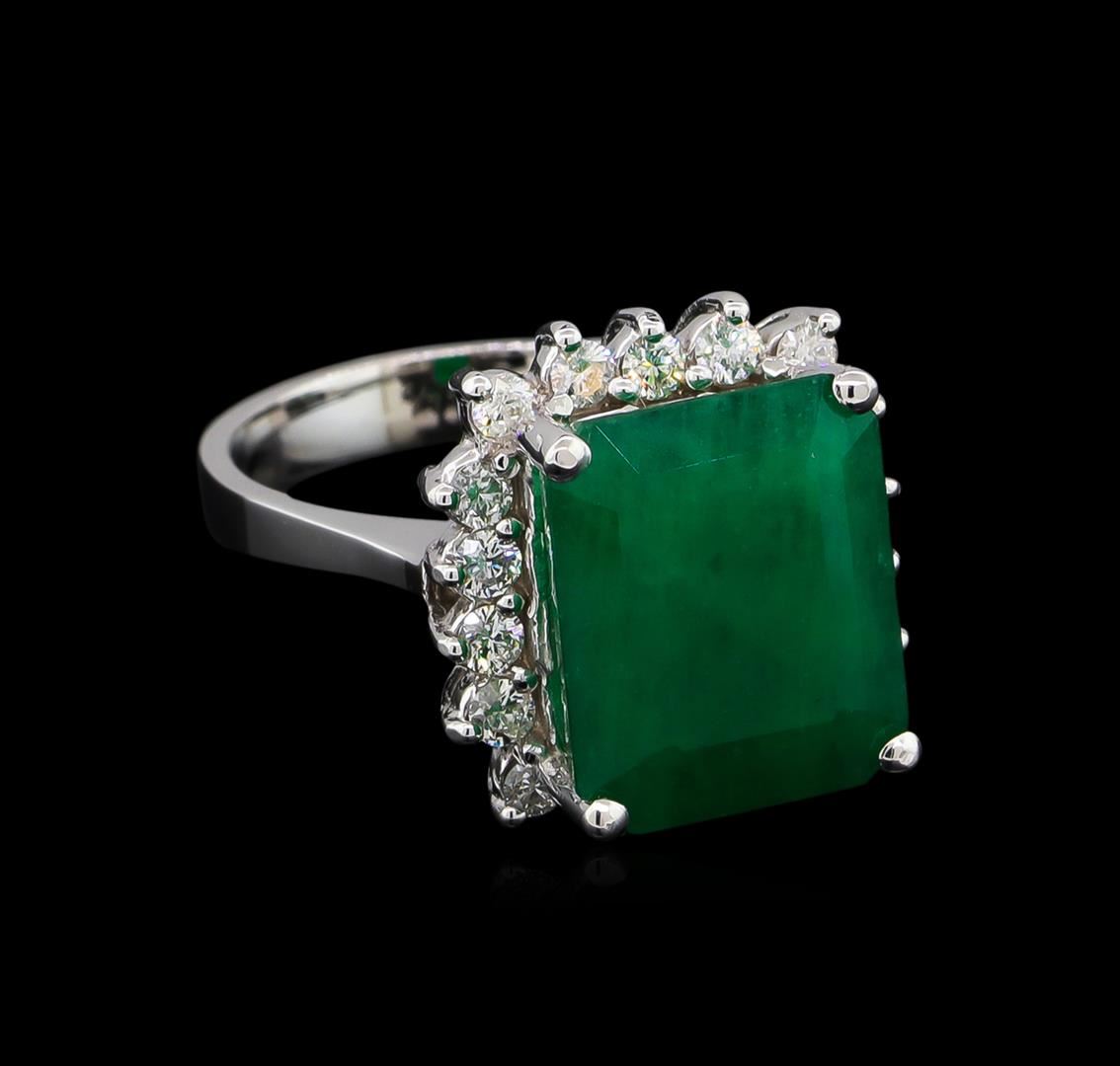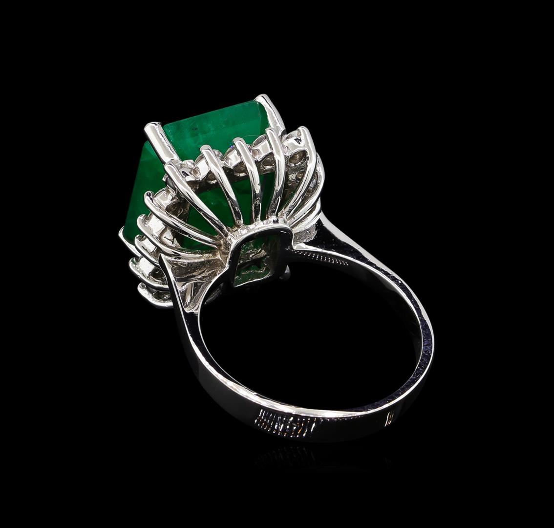 One electronically tested 14KT white gold lady's cast fashion ring with a basket halo with a bright polish finish. The featured lady's ring has a shank measuring 3.05 millimeters wide. Identified with markings of "14K". Condition is new, good workmanship. Containing: One prong set emerald step cut natural emerald, measuring 12.85 x 10.82 x 6.16mm, 15%. bulge factor, approximate weight of 7.22ct., clarity is severely included, type III, medium dark, moderately strong, green color, (GIA G 6/4), cut is very good. Naturally occurring internal & external characteristics are present. Indications of oil residue. Graded in the setting. Eighteen prong set round brilliant cut diamonds, measuring 2.10 - 2.00 x 1.29mm (depth est.) approximate total weight of 18 Stones = 0.59ct. Graded in the setting. Clarity: SI-1 to SI-2. Color: G - Good. Total Weight of Colored Stones 7.22ct. Total Weight of Diamonds 0.59ct. Total Weight of Ring 6.90gm. GAS Appraised at $9,720.00.