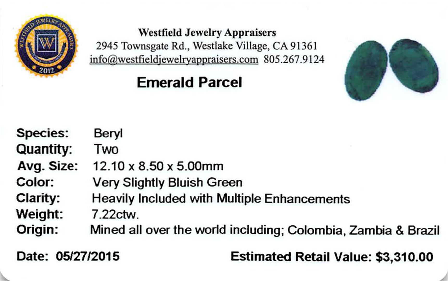 Two oval mixed cut natural emeralds, measuring 12.10 x 8.50 x 5.00mm, exact total weight 7.22ct., clarity is heavily included, medium dark, very slightly grayish, very slightly bluish green color, (GIA vslbG 6/3), cut is good. Transmitting light somewhat diffusely, translucent, Naturally occurring internal & external characteristics are present, Indications of multiple laboratory enhancements, including high temperature heat treatment. Westfield Appraised at $3,310.00.