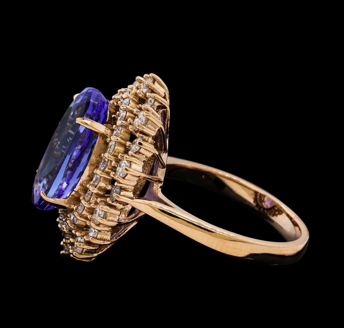 One electronically tested 14KT rose gold lady's cast fashion ring with a staggered basket halo with a bright polish finish. The featured lady's ring has a shank measuring 2.85 millimeters wide. Identified with markings of 'K14'. Condition is new, good workmanship. Containing: One prong set oval modified brilliant cut natural tanzanite, measuring 14.14 x 9.80 x 7.12mm, (depth est.) 4%. bulge factor, approximate weight of 7.22ct., clarity is eye clean, medium, very slightly grayish, violet color, (GIA V 5/3), cut is very good. Transmitting light with no distortion, transparent. Colored gemstones are presumed to have been subjected to commonly used enhancement processes. Graded in the setting. Ten prong set round brilliant cut diamonds, measuring 2.40 - 2.30 x 1.46mm (depth est.) approximate total weight of 10 Stones = 0.50ct. Graded in the setting. Clarity SI-1 to I-1. Color: H - I Cut Good Ten prong set round brilliant cut diamonds, measuring 1.90 - 1.85 x 1.17mm (depth est.) approximate total weight of 10 Stones = 0.25ct. Graded in the setting. Clarity SI-1 to SI-2. Color: H - I Cut Good Twenty-Four prong set round brilliant cut diamonds, measuring 1.75 - 1.65 x 1.05mm (depth est.) approximate total weight of 24 Stones = 0.46ct. Graded in the setting. Clarity SI-1 to SI-2. Color: H - I Cut Good. Total Weight of Colored Stones 7.22ct.. Total Weight of Diamonds 1.21ct.. Total Weight of Ring 7.20gm. GAS Appraised at $11,410.00.