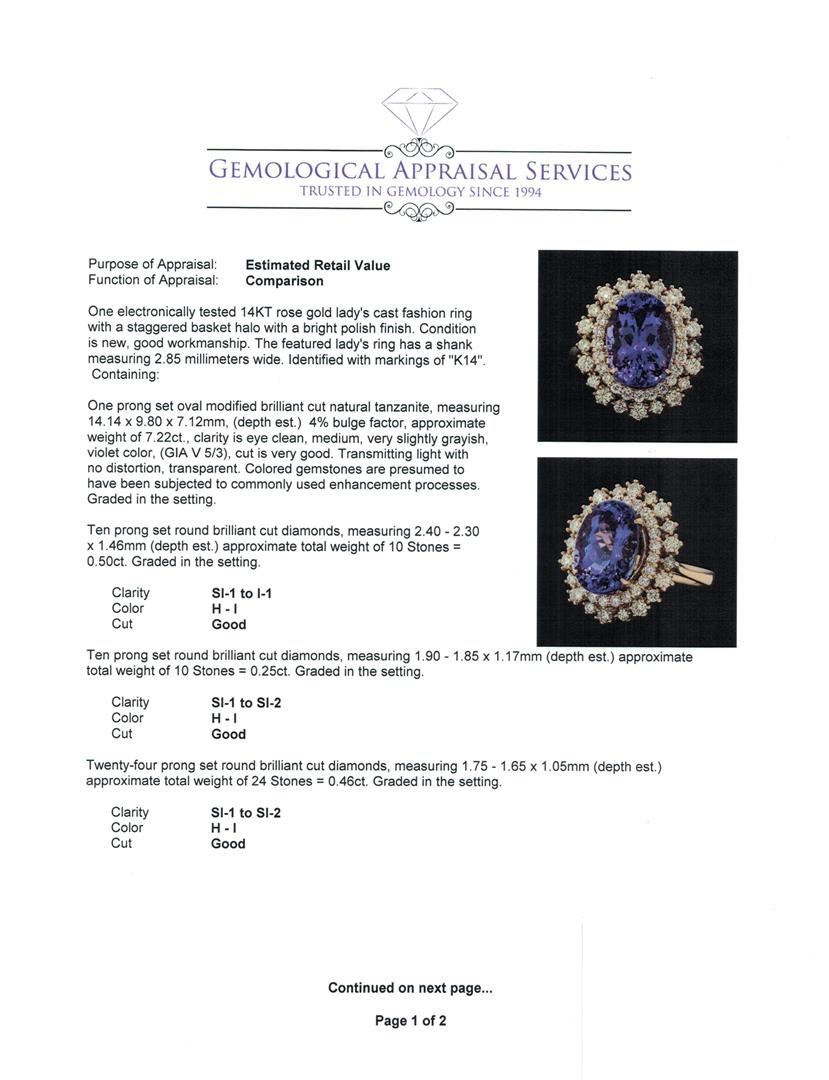 One electronically tested 14KT rose gold lady's cast fashion ring with a staggered basket halo with a bright polish finish. The featured lady's ring has a shank measuring 2.85 millimeters wide. Identified with markings of 'K14'. Condition is new, good workmanship. Containing: One prong set oval modified brilliant cut natural tanzanite, measuring 14.14 x 9.80 x 7.12mm, (depth est.) 4%. bulge factor, approximate weight of 7.22ct., clarity is eye clean, medium, very slightly grayish, violet color, (GIA V 5/3), cut is very good. Transmitting light with no distortion, transparent. Colored gemstones are presumed to have been subjected to commonly used enhancement processes. Graded in the setting. Ten prong set round brilliant cut diamonds, measuring 2.40 - 2.30 x 1.46mm (depth est.) approximate total weight of 10 Stones = 0.50ct. Graded in the setting. Clarity SI-1 to I-1. Color: H - I Cut Good Ten prong set round brilliant cut diamonds, measuring 1.90 - 1.85 x 1.17mm (depth est.) approximate total weight of 10 Stones = 0.25ct. Graded in the setting. Clarity SI-1 to SI-2. Color: H - I Cut Good Twenty-Four prong set round brilliant cut diamonds, measuring 1.75 - 1.65 x 1.05mm (depth est.) approximate total weight of 24 Stones = 0.46ct. Graded in the setting. Clarity SI-1 to SI-2. Color: H - I Cut Good. Total Weight of Colored Stones 7.22ct.. Total Weight of Diamonds 1.21ct.. Total Weight of Ring 7.20gm. GAS Appraised at $11,410.00.
