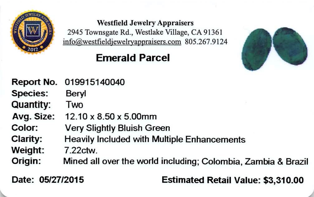 Two oval mixed cut natural emeralds, measuring 12.10 x 8.50 x 5.00mm, exact total weight 7.22ct., clarity is heavily included, medium dark, very slightly grayish, very slightly bluish green color, (GIA vslbG 6/3), cut is good. Transmitting light somewhat diffusely, translucent, Naturally occurring internal & external characteristics are present, Indications of multiple laboratory enhancements, including high temperature heat treatment. Westfield Appraised at $3,310.00.