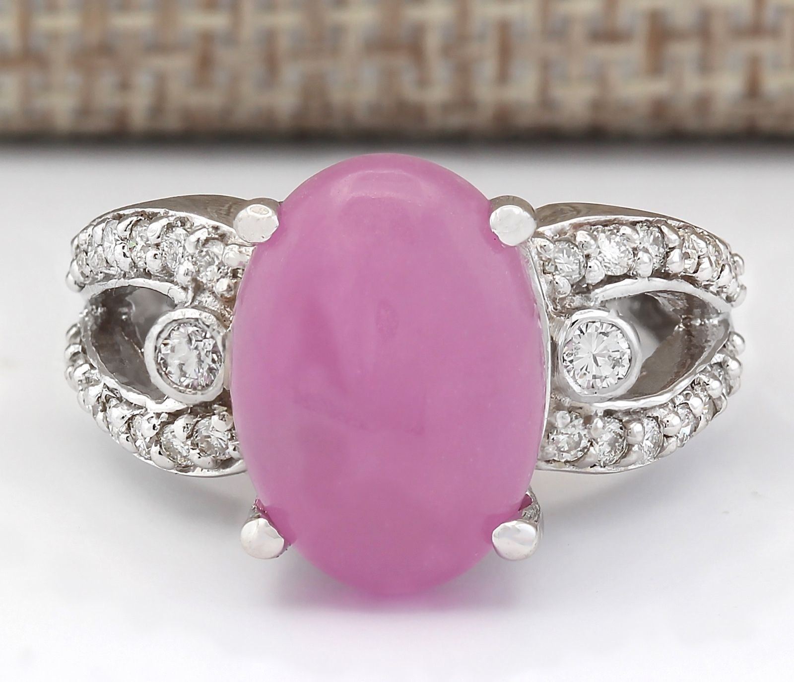 7.25 CTW Natural Pink Jade And Diamond Ring In 18K White Gold