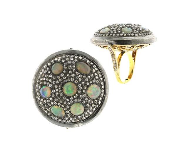OPAL AND DIAMOND RING/Diamond Count 1:/Diamond Total Carat :3.5/Diamond Color & Clarity:J-L/I1-I2 Single Cut /Diamond Count 2:/Diamond 2 CTW:/Diamond Count 3:/Gemstone Count 1:/Gemstone CTW:3.75/Gemstone Dimension:/Gemstone Shape:Opal - Mix sizes /Gemstone Count 2:/Gemstone Shape:/Ring Dimension:/Metal Type 1:14kYellow Gold :Gram Weight:3.3/Metal Type 2:over0.925Sterling Silver / Weight Gram:24.49/Gross Weight :29.24/Ring Size:7