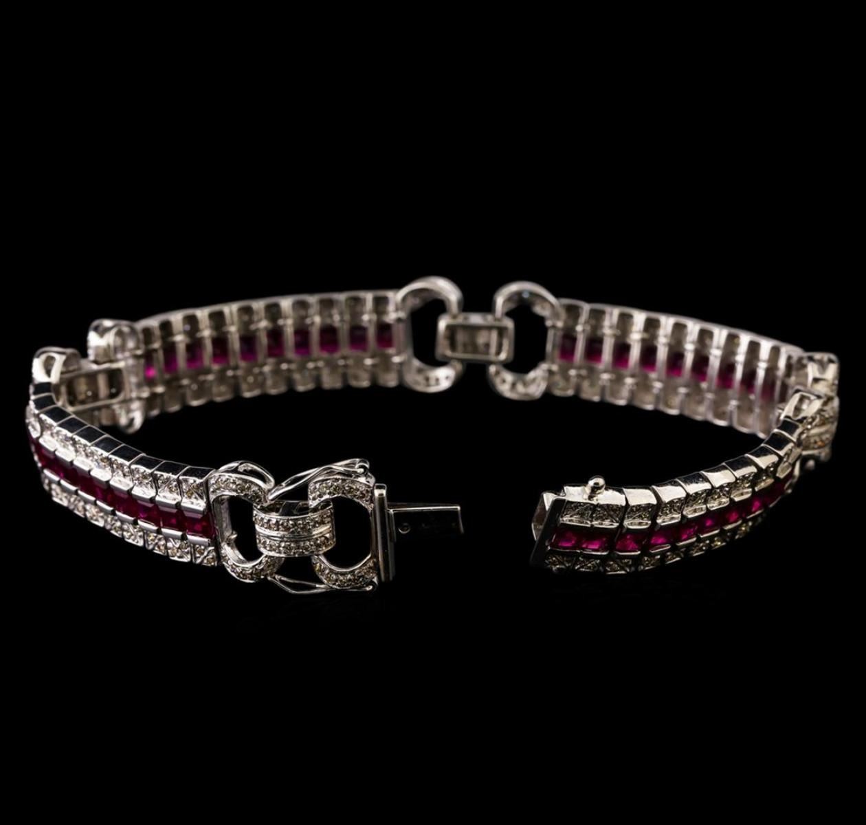 One electronically tested 14KT white gold ladies cast & assembled laboratory created ruby and diamond bracelet. Seven and three-quarter inch length bracelet features a series of four flexible laboratory created ruby and diamond set links attached to each other by diamond set buckle links, terminating in a hidden clasp with twin safeties. Bright polish finish with milgrain detailing. Identified with markings of '585'. Condition is good. Containing: Forty channel set square step cut laboratory created rubies, measuring 3.10 x 3.00 x 1.98mm, approximate total weight of 7.25ct., clarity is slightly included, type II, medium dark, very slightly brownish, slightly purplish red color, (GIA slpR 6/3), cut is good. Transmitting light with a minimum of distortion, transparent. Laboratory created flux internal characteristics are present. Measurements & the color grade are an average for the group. Graded in the setting. Two Hundred Eighty bead set round brilliant cut diamonds, measuring 1.20 - 1.10 x 0.69mm (depth est.) approximate total weight of 280 Stones = 1.65ct. Graded in the setting. Clarity SI-1 to SI-2. Color: H - J. Total Weight of Colored Stones 7.25ct.. Total Weight of Diamonds 1.65ct.. Total Weight of Bracelet 33.72gm. AIG Appraised.