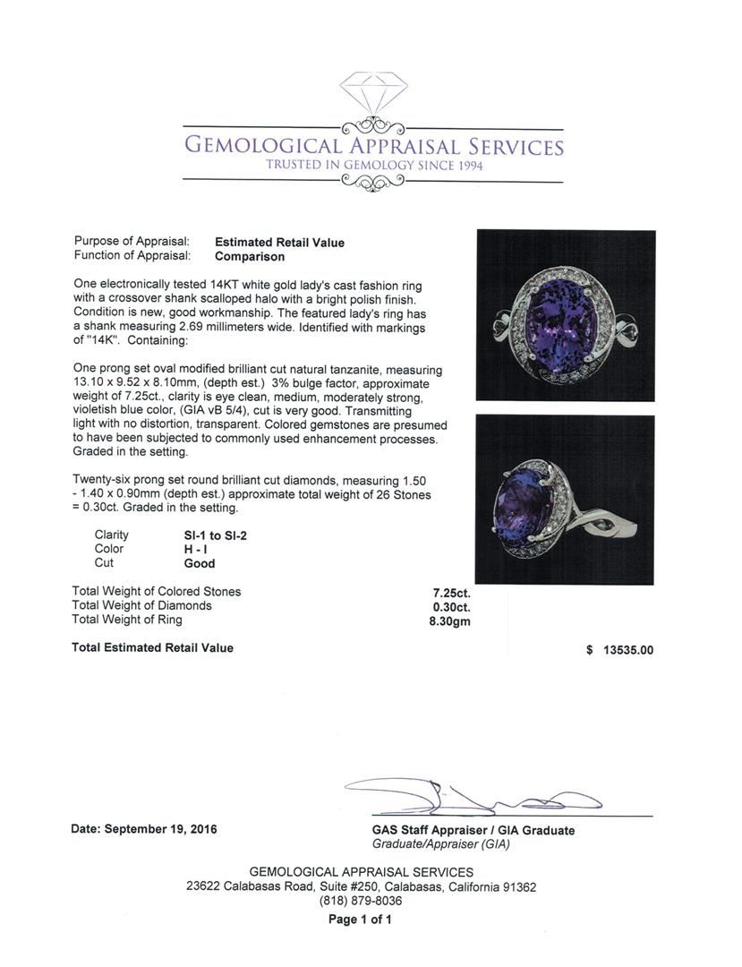 One electronically tested 14KT white gold lady's cast fashion ring with a crossover shank scalloped halo with a bright polish finish. The featured lady's ring has a shank measuring 2.69 millimeters wide. Identified with markings of '14K'. Condition is new, good workmanship. Containing: One prong set oval modified brilliant cut natural tanzanite, measuring 13.10 x 9.52 x 8.10mm, (depth est.) 3%. bulge factor, approximate weight of 7.25ct., clarity is eye clean, medium, moderately strong, violetish blue color, (GIA vB 5/4), cut is very good. Transmitting light with no distortion, transparent. Colored gemstones are presumed to have been subjected to commonly used enhancement processes. Graded in the setting. Twenty-Six prong set round brilliant cut diamonds, measuring 1.50 - 1.40 x 0.90mm (depth est.) approximate total weight of 26 Stones = 0.30ct. Graded in the setting. Clarity SI-1 to SI-2. Color: H - I Cut Good. Total Weight of Colored Stones 7.25ct.. Total Weight of Diamonds 0.30ct.. Total Weight of Ring 8.30gm. GAS Appraised at $13,535.00.