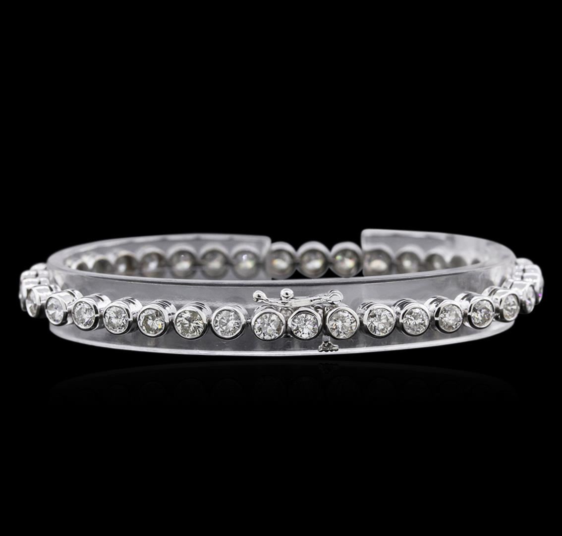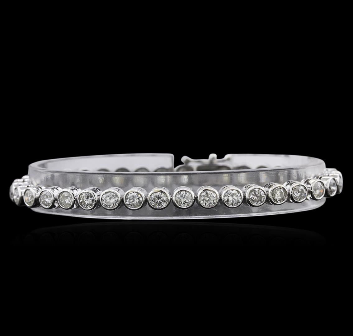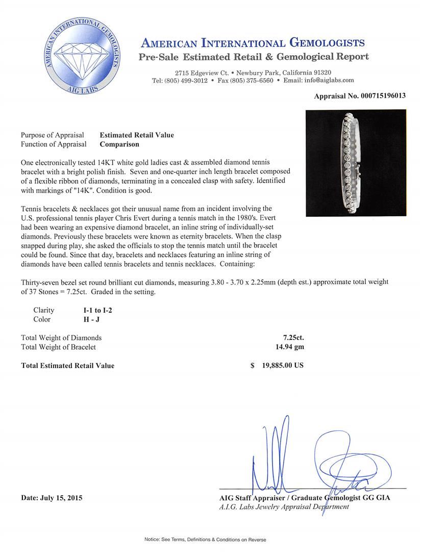 One electronically tested 14KT white gold ladies cast & assembled diamond tennis bracelet with a bright polish finish. Seven and one-quarter inch length bracelet composed of a flexible ribbon of diamonds, terminating in a concealed clasp with safety. Identified with markings of "14K". Condition is good. Tennis bracelets & necklaces got their unusual name from an incident involving the U.S. professional tennis player Chris Evert during a tennis match in the 1980's. Evert had been wearing an expensive diamond bracelet, an inline string of individually-set diamonds. Previously these bracelets were known as eternity bracelets. When the clasp snapped during play, she asked the officials to stop the tennis match until the bracelet could be found. Since that day, bracelets and necklaces featuring an inline string of diamonds have been called tennis bracelets and tennis necklaces. Containing: Thirty-Seven bezel set round brilliant cut diamonds, measuring 3.80 - 3.70 x 2.25mm (depth est.) approximate total weight of 37 Stones = 7.25ct. Graded in the setting. Clarity: I-1 to I-2. Color: H - J. Total Weight of Diamonds 7.25ct. Total Weight of Bracelet 14.94gm. AIG Appraised at $19,885.00.