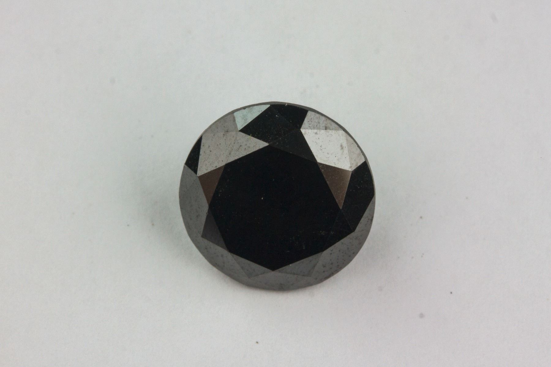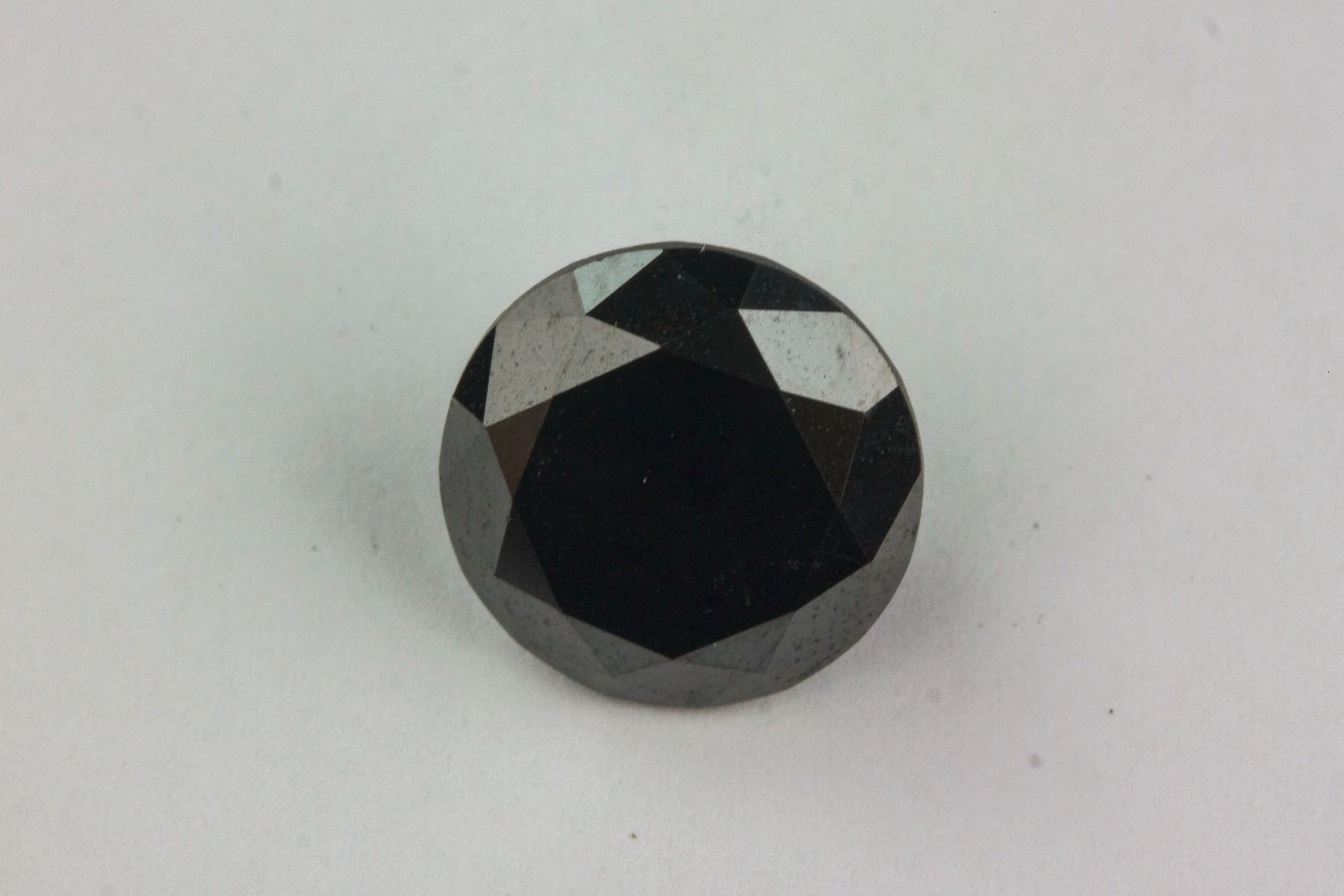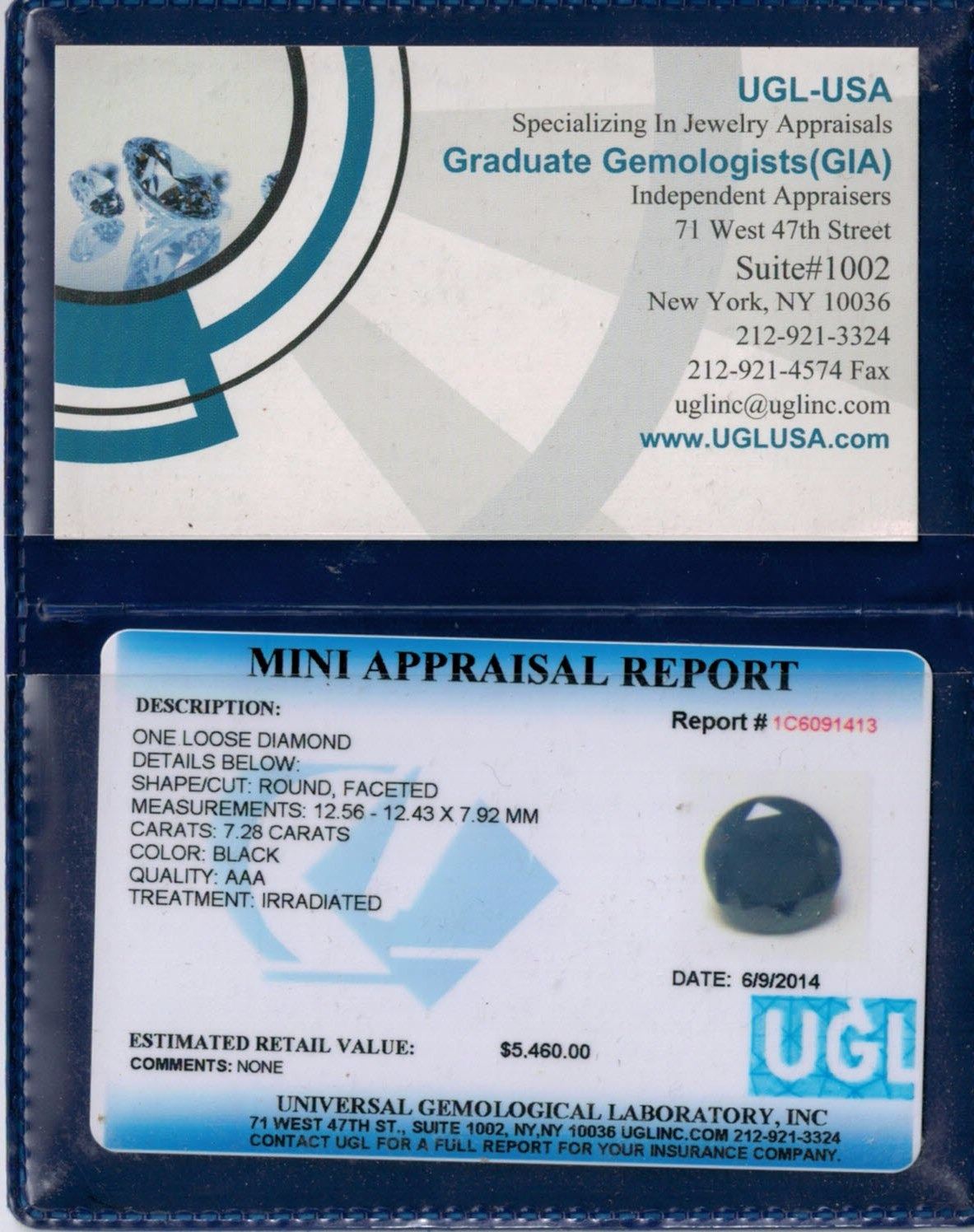One loose, round faceted Black Diamond. Measures 12.56 -12.43 x 7.92 mm. 7.28 carats, Quality AAA treated. Certified by the UGL in NY State with an appraisal value of $5460
