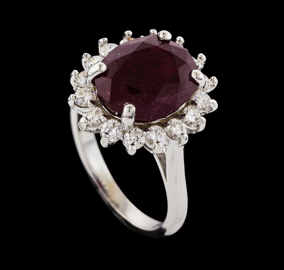One Ruby and Diamond Ring featuring: 14KT White Gold with a total weight of 5.13 grams, One Ruby stone with a total weight of 7.28ct, and 16 Diamonds with a total weight of 0.88ctw.
