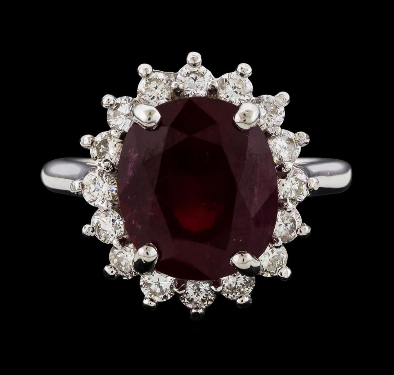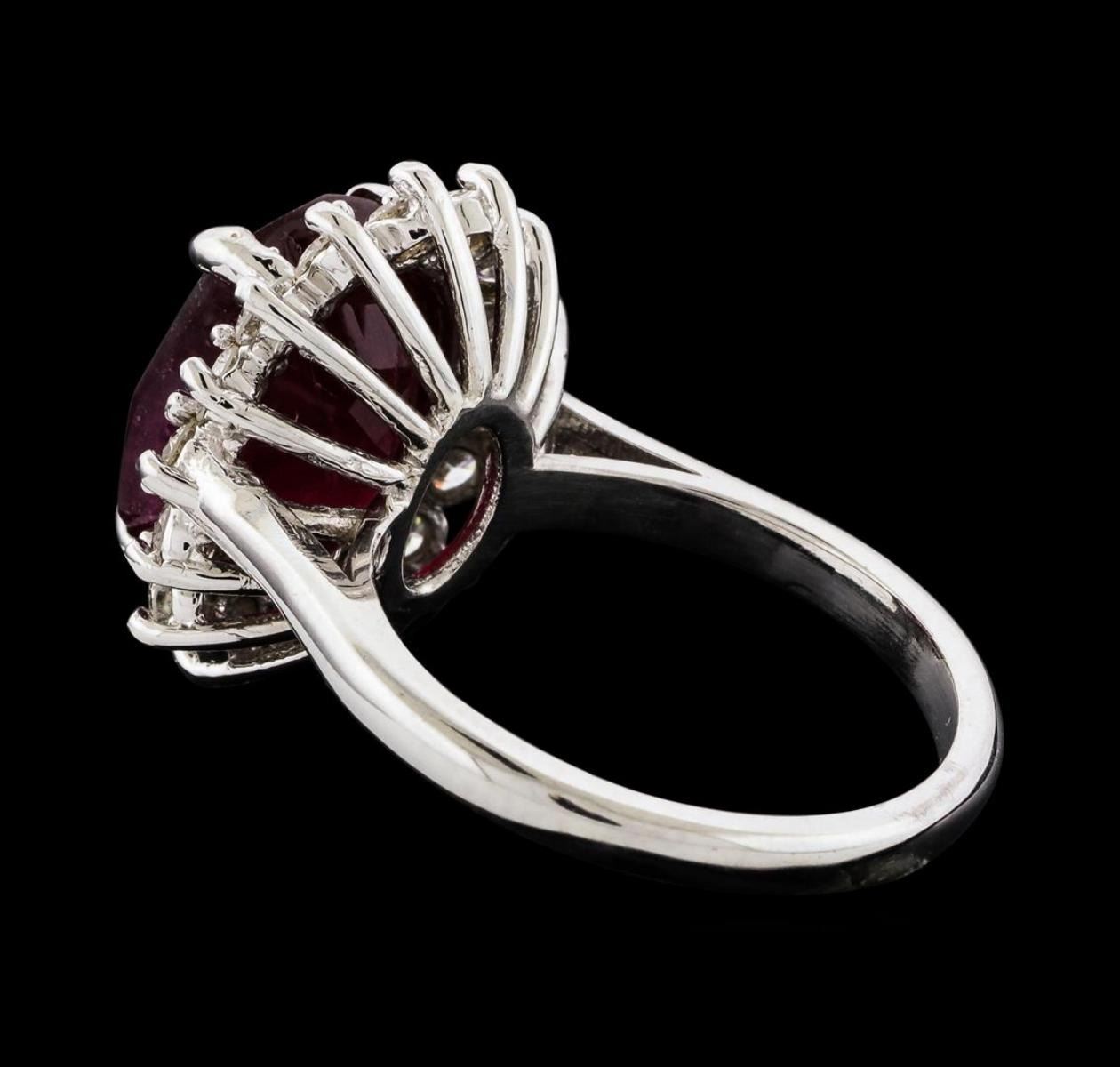 One Ruby and Diamond Ring featuring: 14KT White Gold with a total weight of 5.13 grams, One Ruby stone with a total weight of 7.28ct, and 16 Diamonds with a total weight of 0.88ctw.