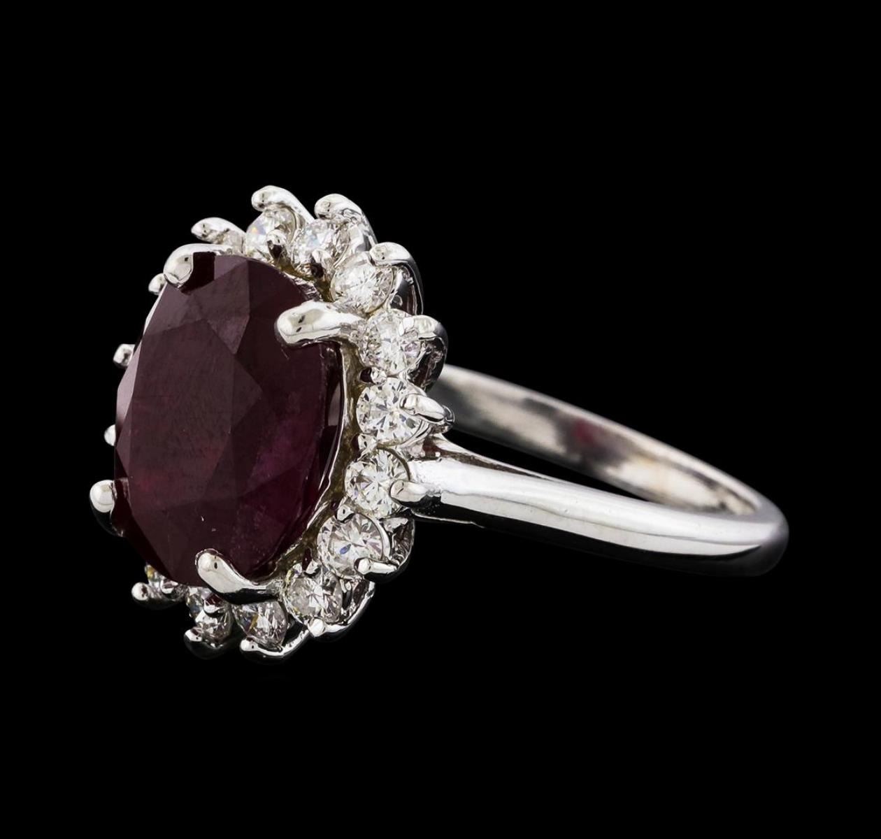 One Ruby and Diamond Ring featuring: 14KT White Gold with a total weight of 5.13 grams, One Ruby stone with a total weight of 7.28ct, and 16 Diamonds with a total weight of 0.88ctw.